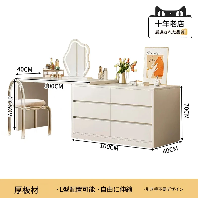 【雲の鏡+アクリル椅子セット】1mテーブル+1m六段チェスト 暖白