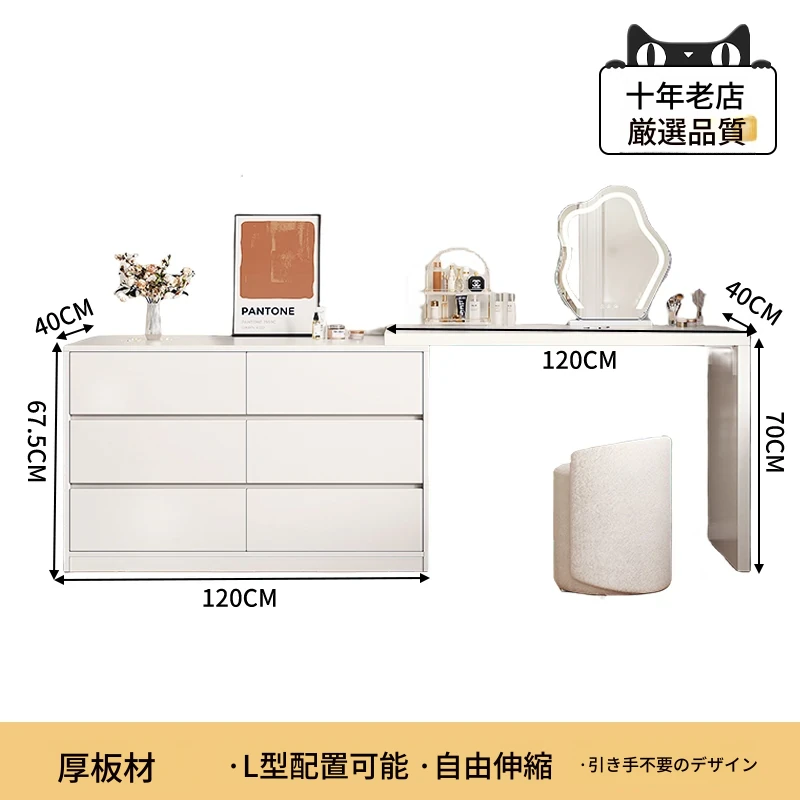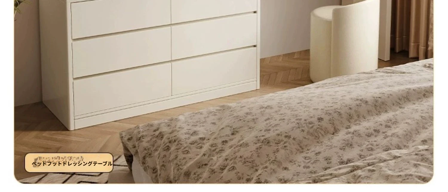 【雲の鏡+皮製スツールセット】1.2mテーブル+1.2m六段チェスト 暖白