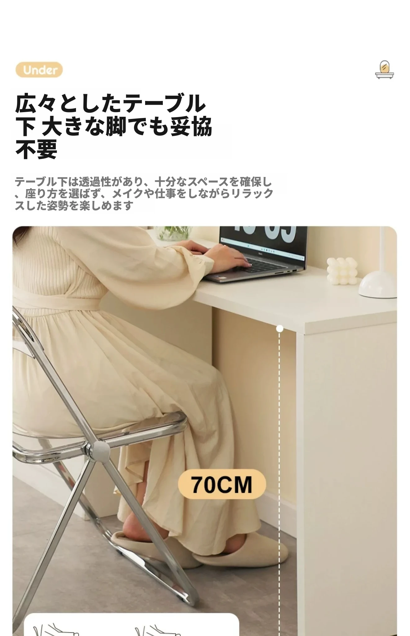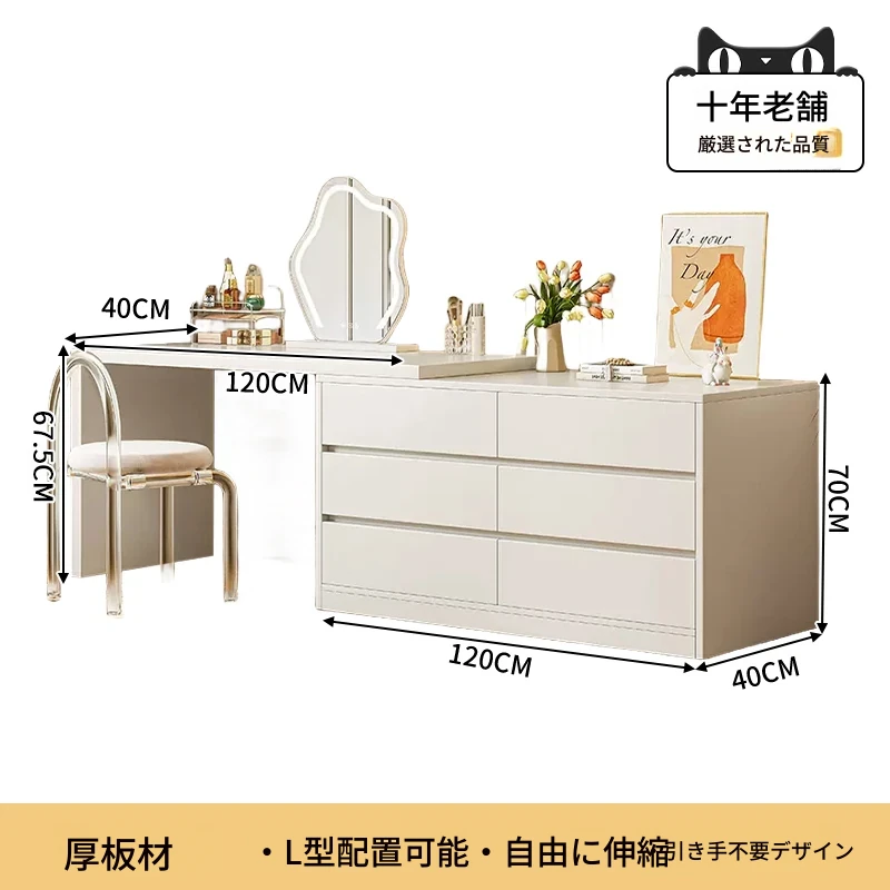 【雲の鏡+アクリル椅子セット】1.2mテーブル+1.2m六段チェスト 暖白