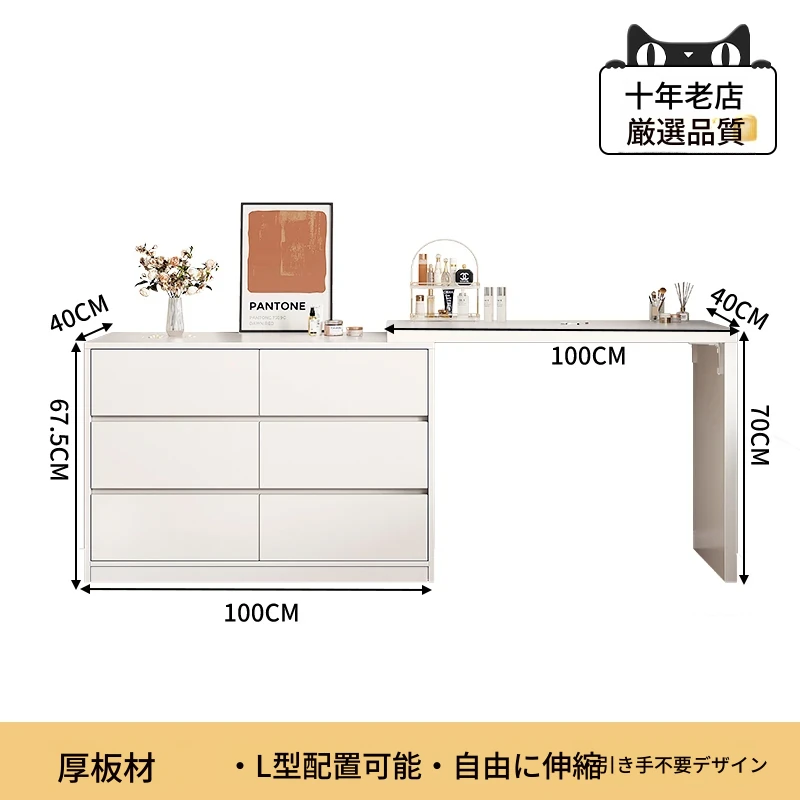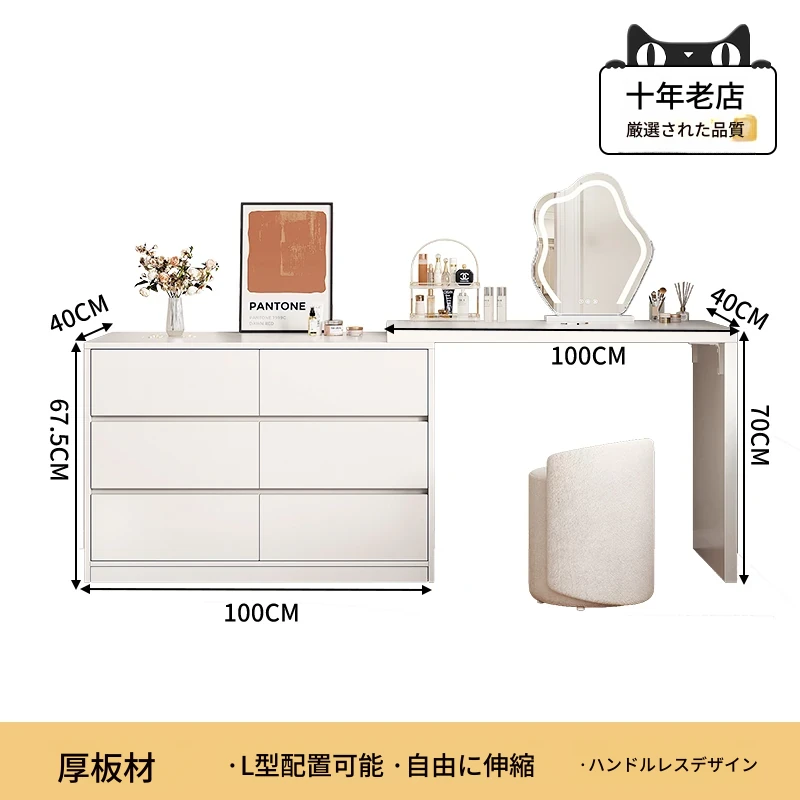 【雲の鏡+皮製スツールセット】1mテーブル+1m六段チェスト 暖白