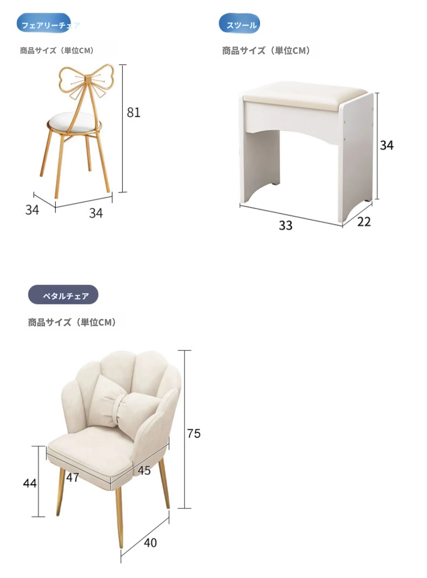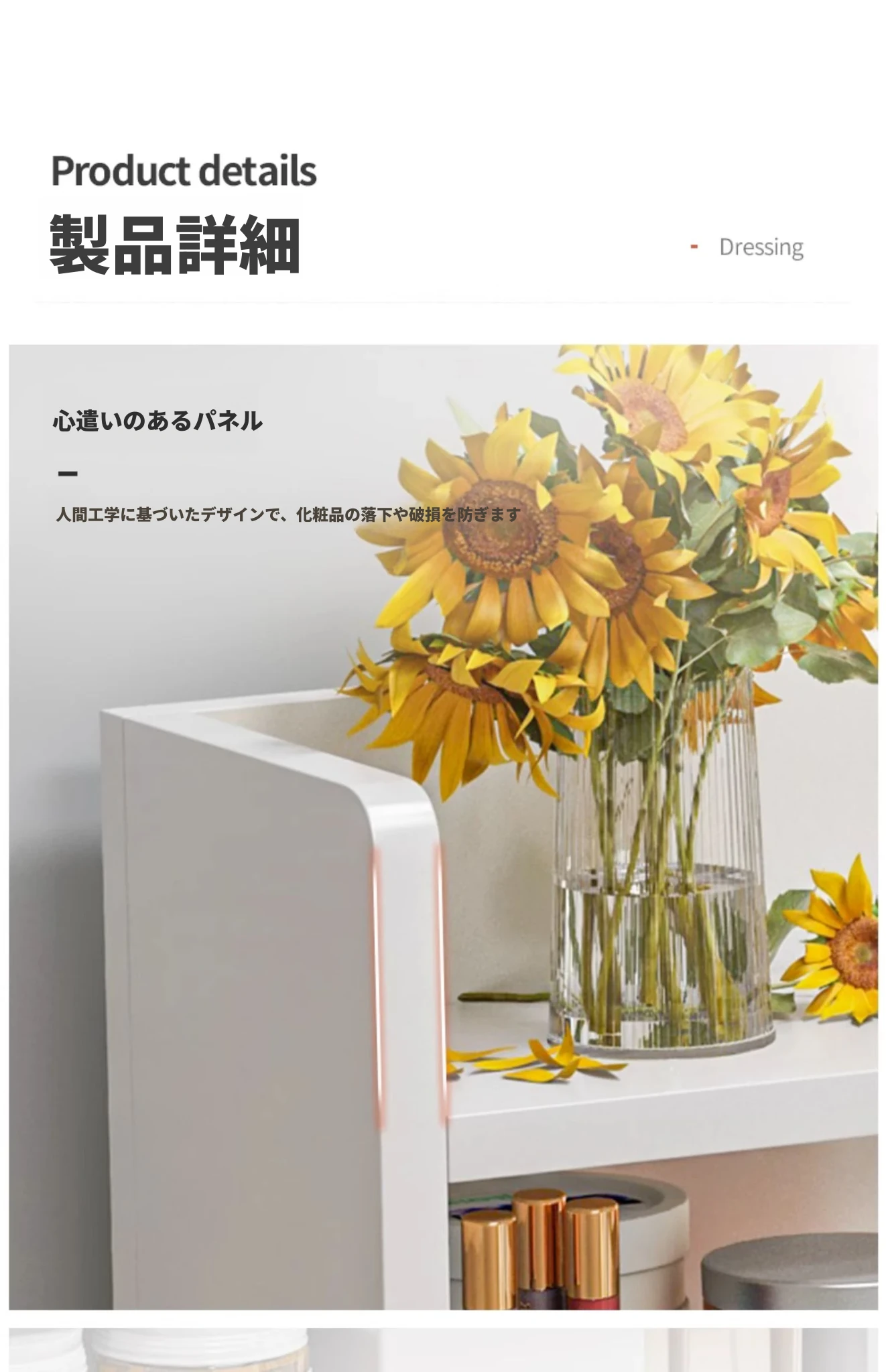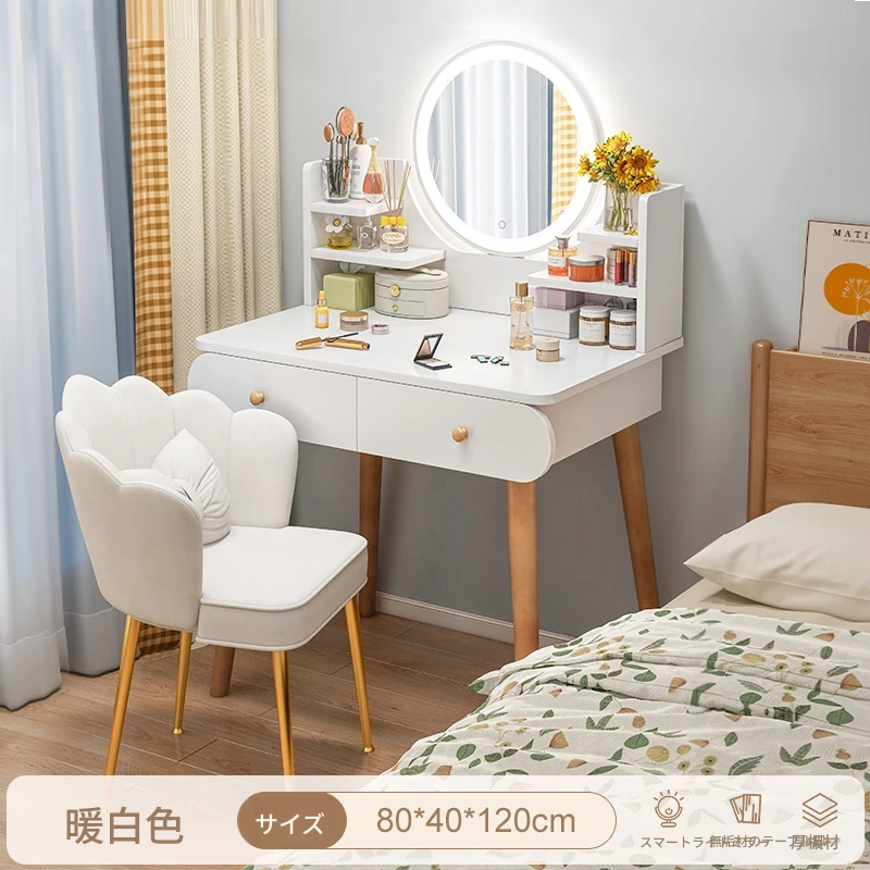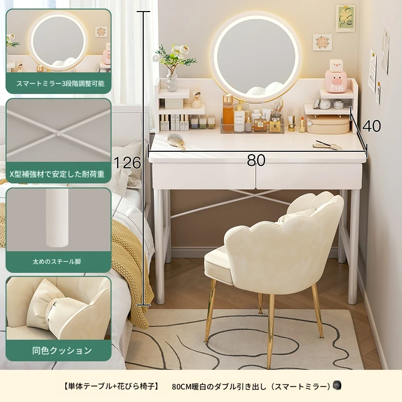 アップグレード鋼脚⭐【スマートミラー+ダブル引き出し+花びら椅子】80cm(太い鋼脚 安定支え)