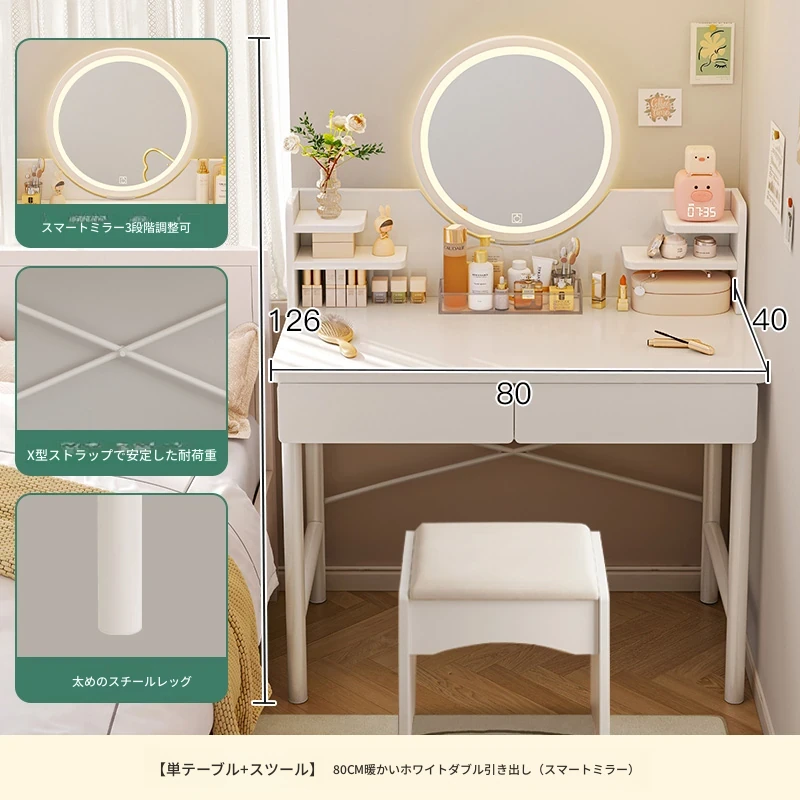 アップグレード鋼脚⭐【スマートミラー+ダブル引き出し+スツール】80cm(太い鋼脚 安定支え)