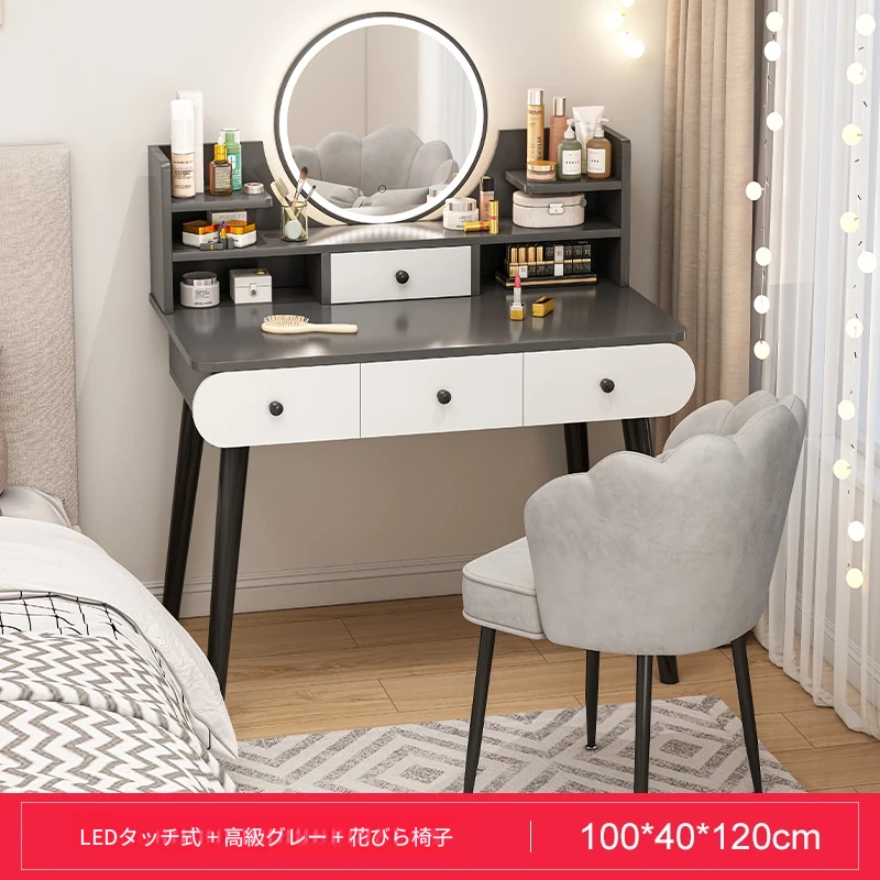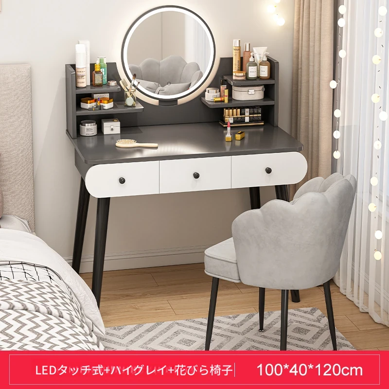 スマートミラー⭐【トリプル引き出し+花びら椅子】100cm高級グレー●
