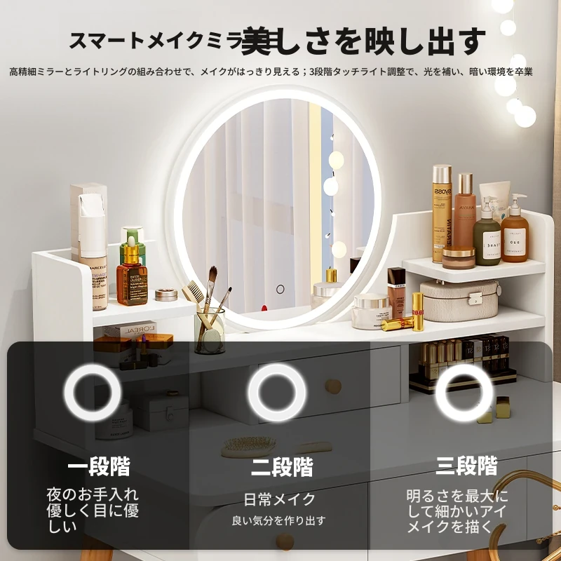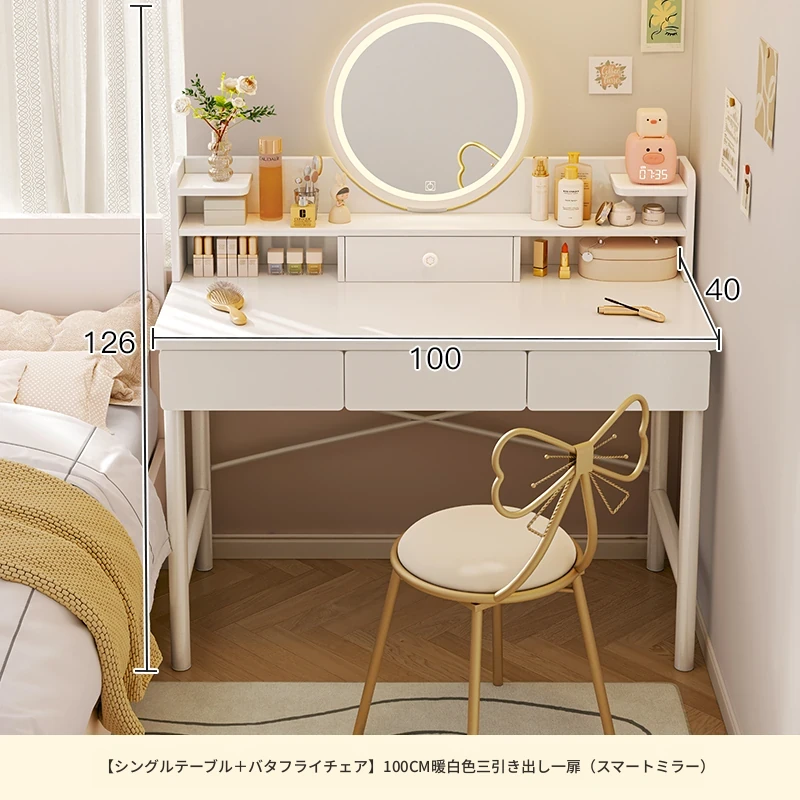 スマートミラー⭐【トリプル引き出し+フェアリー椅子】100cm暖白●