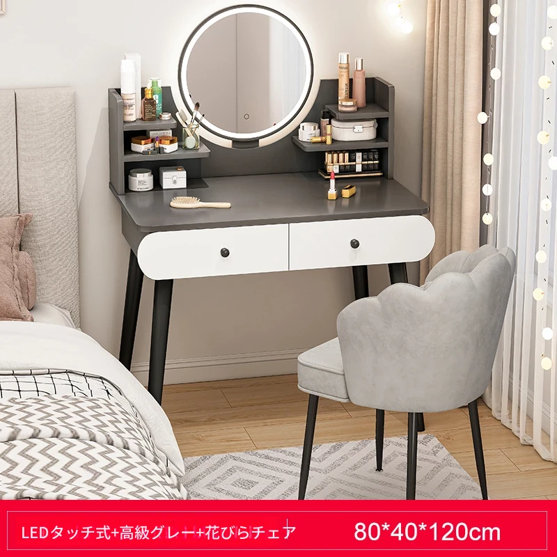 スマートミラー ⭐ 【ダブル引き出し+花びら椅子】80cm高級グレー ●