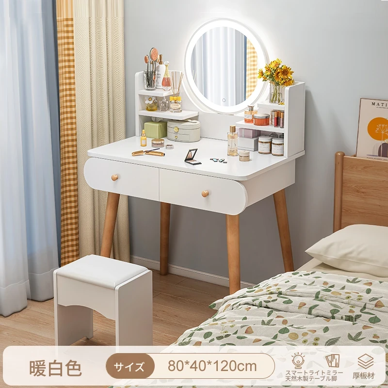 スマートミラー⭐【ダブル引き出し+スツール】80cm暖白●