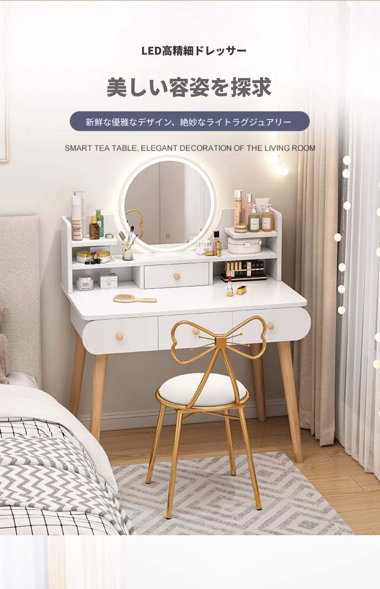 スマートミラー⭐【ダブル引き出し+フェアリー椅子】80cm暖白●