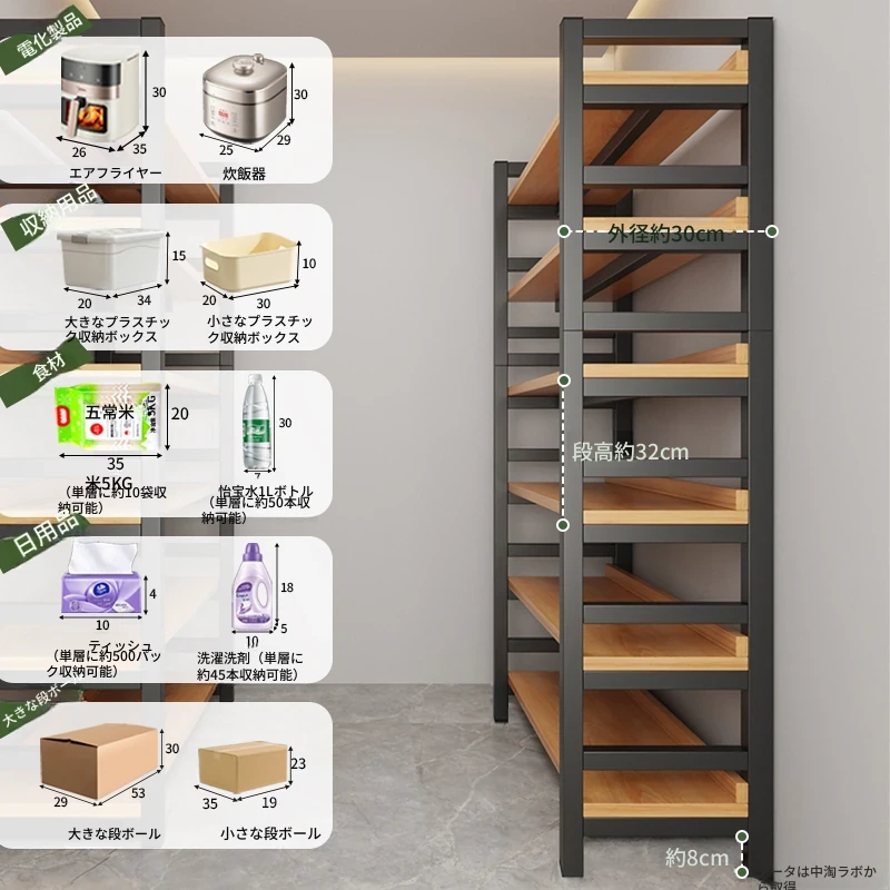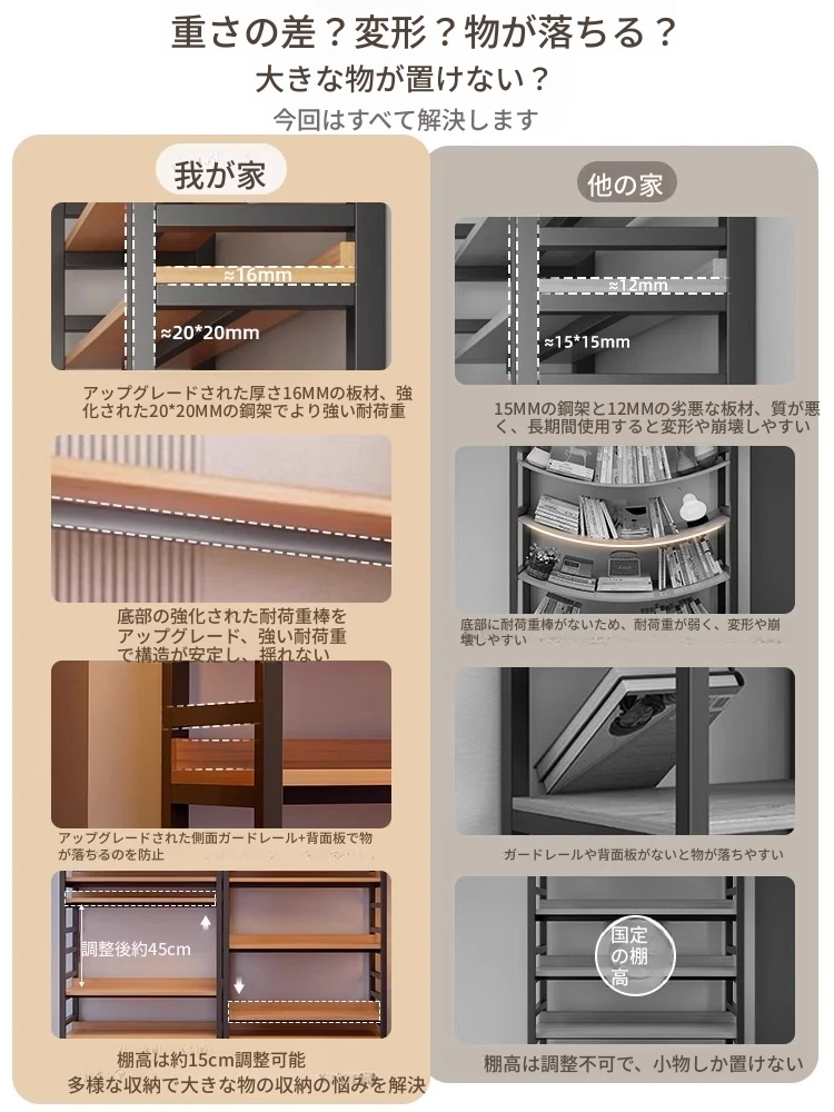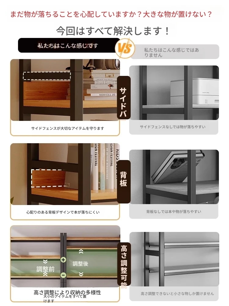 【落下防止 アップグレード側板+背板】【棚の高さ調整 大型商品も収納可能】