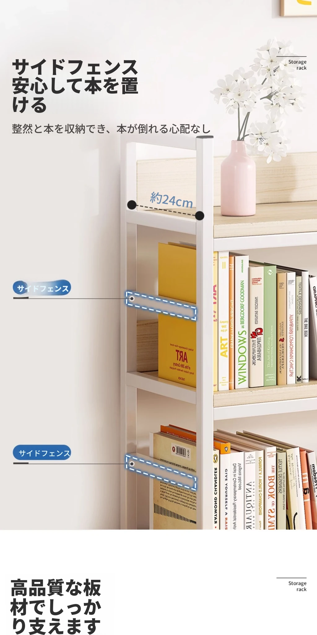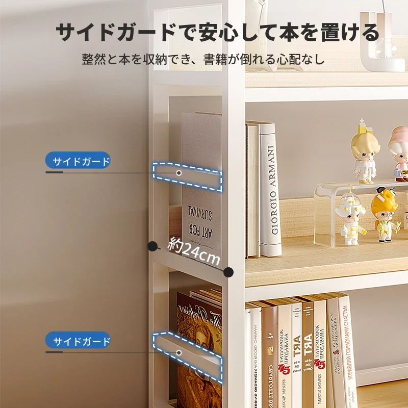 【クラシックベストセラー-サイドガード付き-本が倒れない】ブラッシュホワイトオーク色+ホワイトフレーム50CM