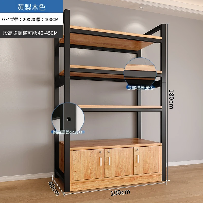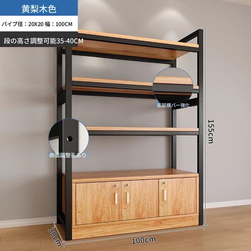 【35-40層高 ダブルボトム横バー】黄梨木+黒フレーム4段棚100CM 【アップグレード扉ロック付き】