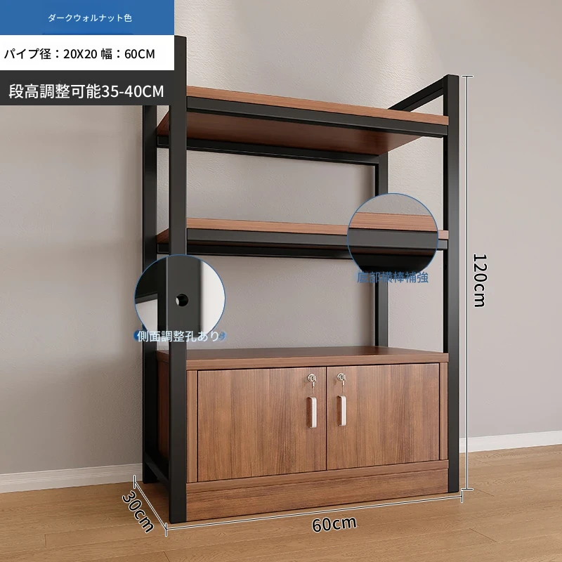 【35-40層高 ダブルボトム横バー】深胡桃+黒フレーム3段棚60CM 【アップグレード扉ロック付き】