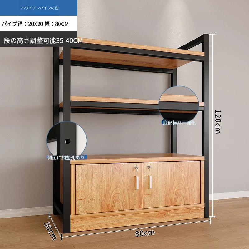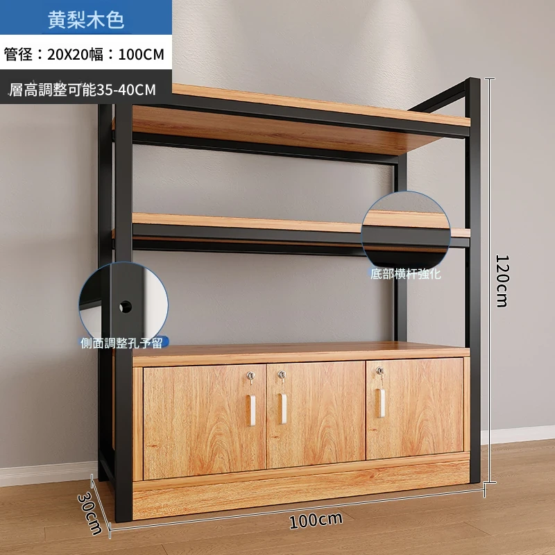 【35-40層高 ダブルボトム横バー】黄梨木+黒フレーム3段棚120CM 【アップグレード扉ロック付き】