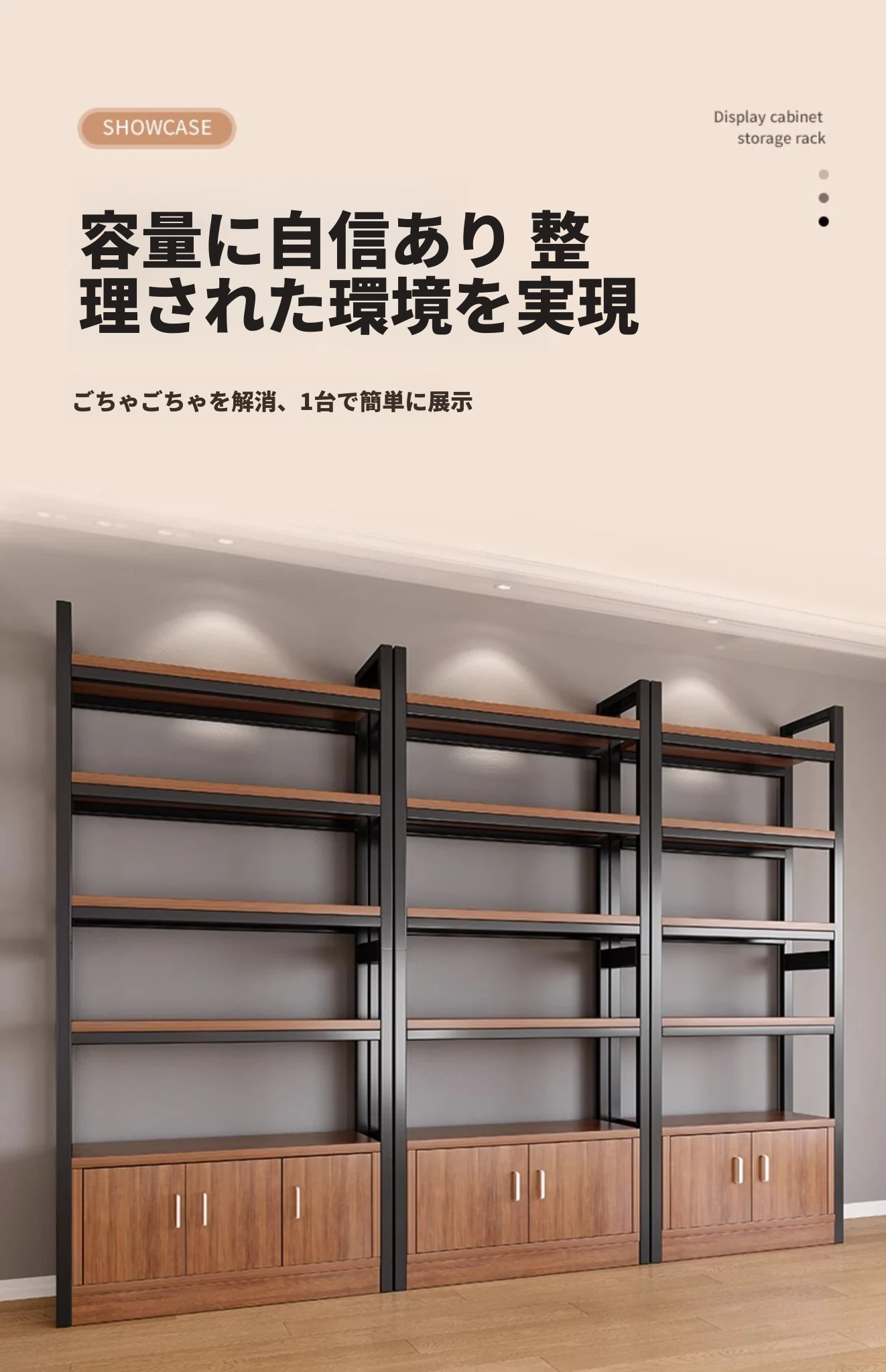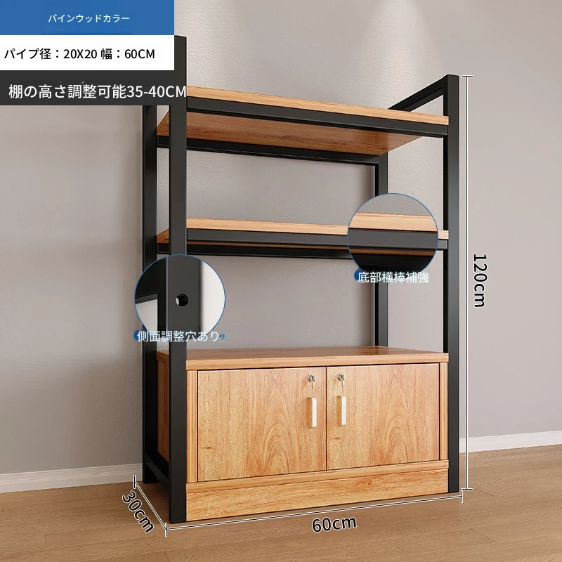 【35-40層高 ダブルボトム横バー】黄梨木+黒フレーム3段棚60CM 【アップグレード扉ロック付き】