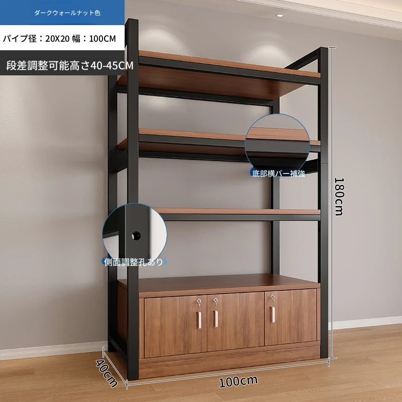 【40-45層高 深く高く】深胡桃+黒フレーム4段棚100x40x180 【アップグレード扉ロック付き】