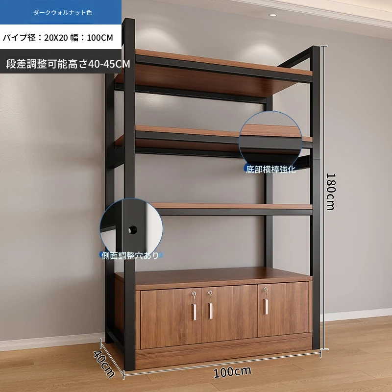 【40-45層高 加深加高】ダークウォールナット+ブラックフレーム四段棚100x40x180 【アップグレード扉ロック付き】