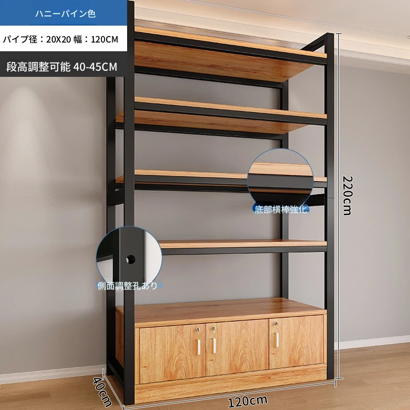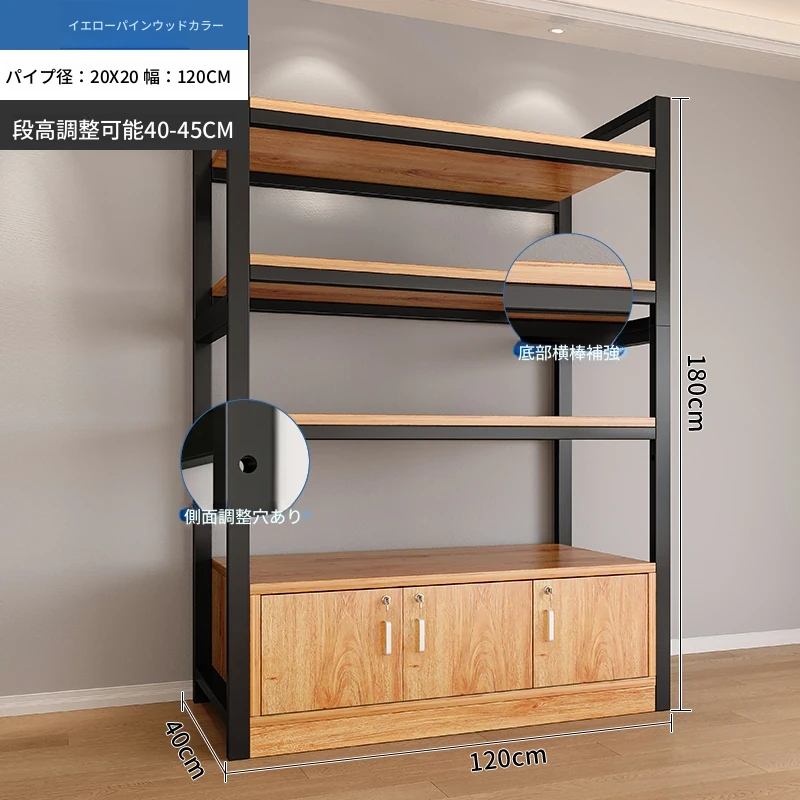 【40-45層高 加深加高】バンブーウッド+ブラックフレーム四段棚120x40x180 【アップグレード扉ロック付き】