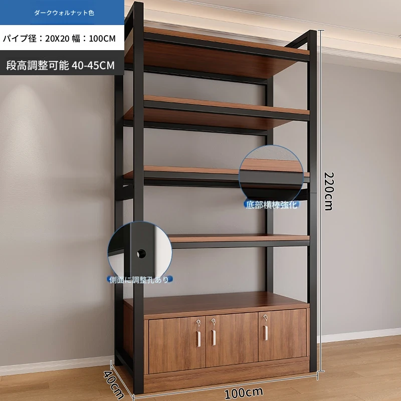【40-45層高 加深加高】ダークウォールナット+ブラックフレーム五段棚100x40x220 【アップグレード扉ロック付き】