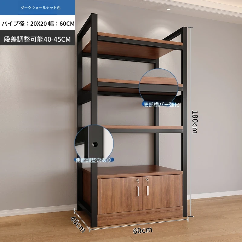 【40-45層高 加深加高】ダークウォールナット+ブラックフレーム四段棚60x40x180 【アップグレード扉ロック付き】