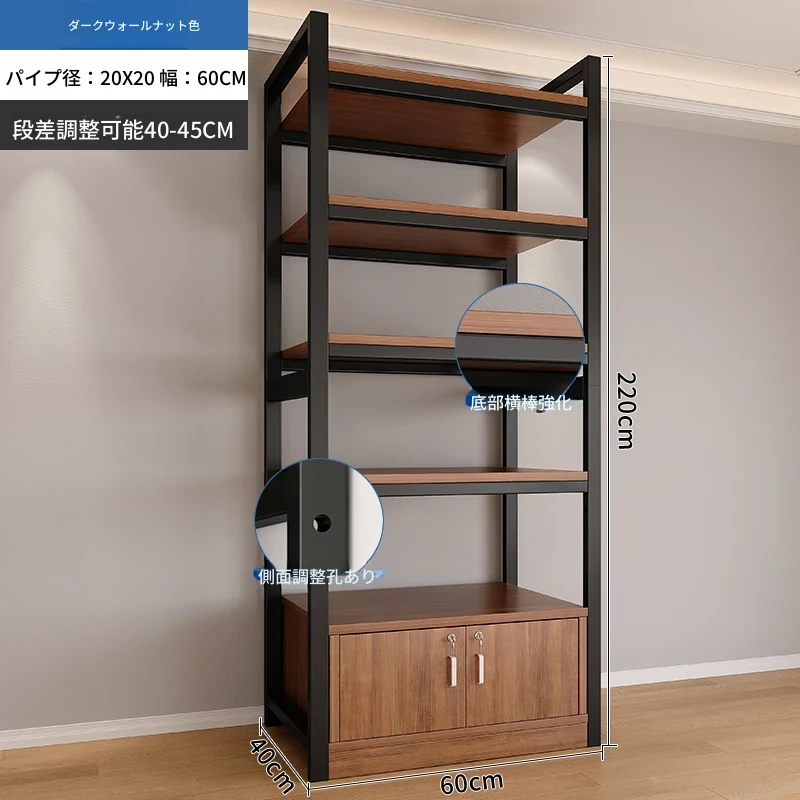 【40-45層高 加深加高】ダークウォールナット+ブラックフレーム五段棚60x40x220 【アップグレード扉ロック付き】
