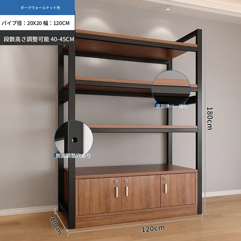 【40-45層高 加深加高】ダークウォールナット+ブラックフレーム四段棚120x40x180 【アップグレード扉ロック付き】