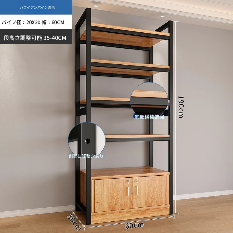 【35-40層高 二重底横棒】パインウッド+黒フレーム五段ラック60CM