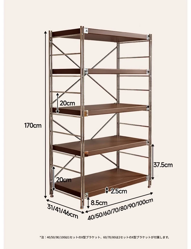 (太い無垢ステンレス 50年壊れない)【41深】5段-ウォールナット色60x41x170