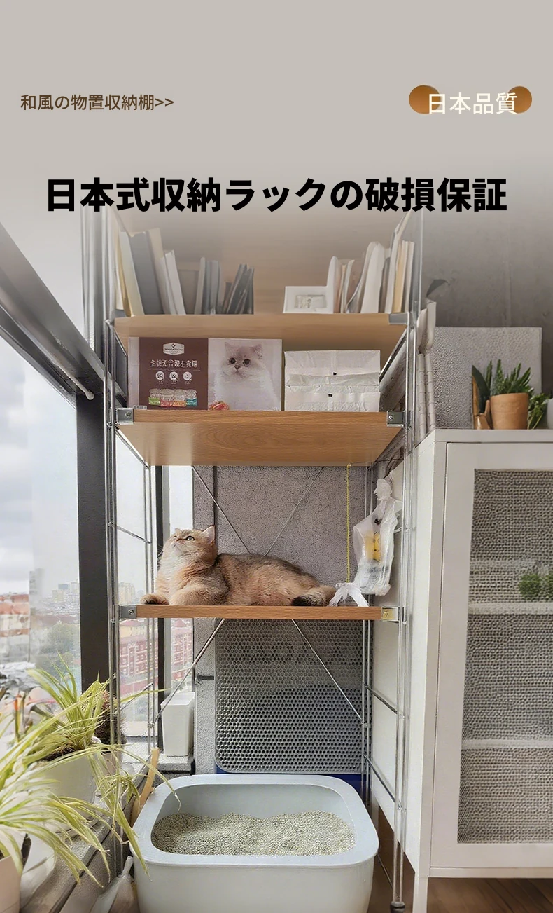 キャットカフェ収納ラック - 猫トイレ上の便利な多層収納!ペット用品やおやつを美しくディスプレイできる、スタイリッシュで実用的なアイテムです。猫ちゃんと一緒におしゃれな空間を作りましょう!