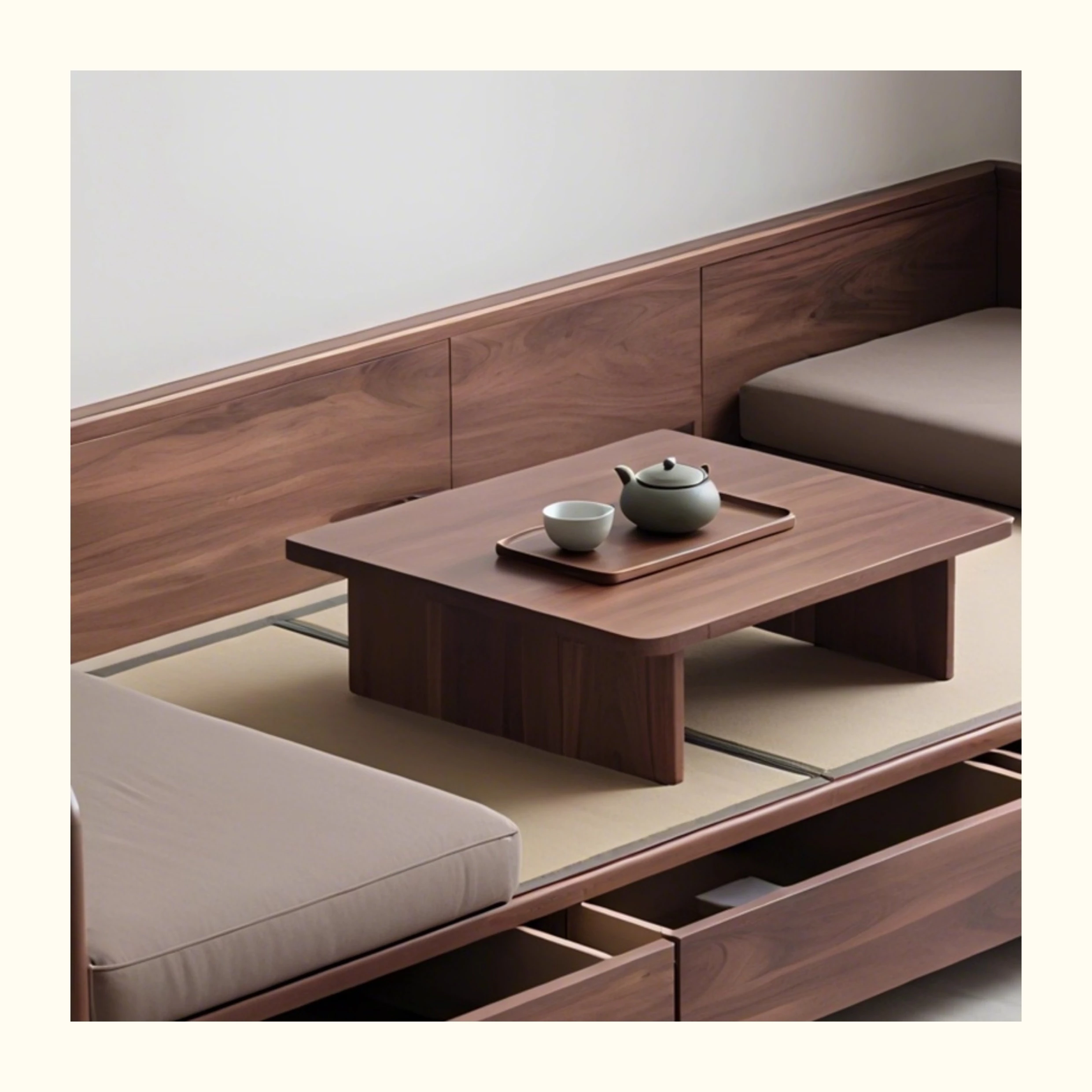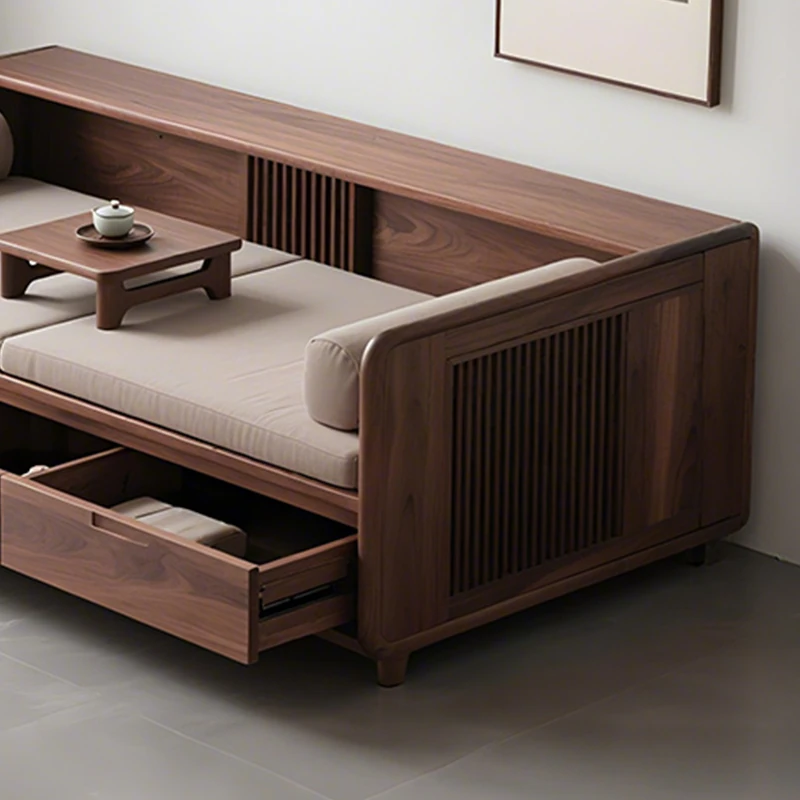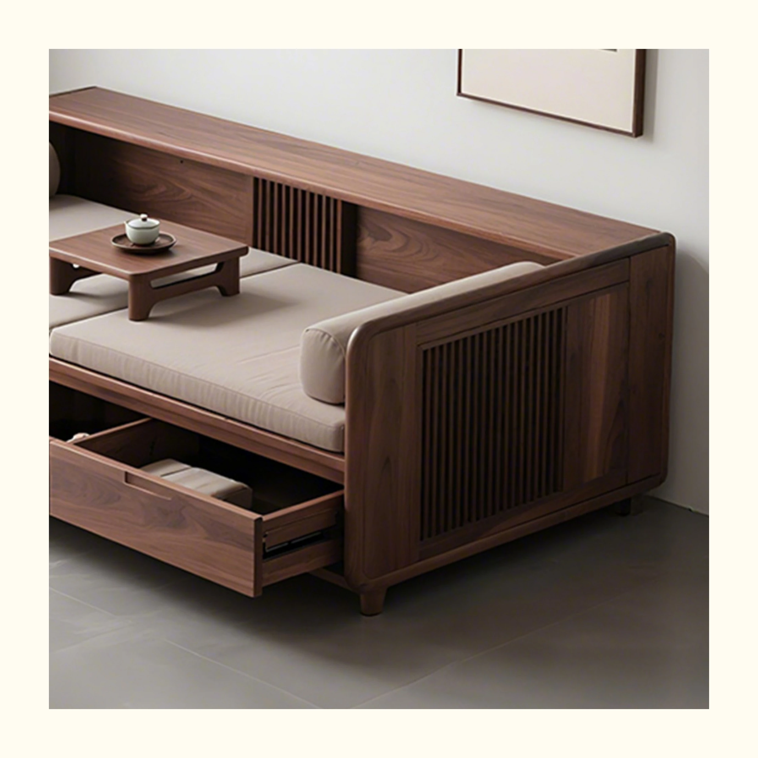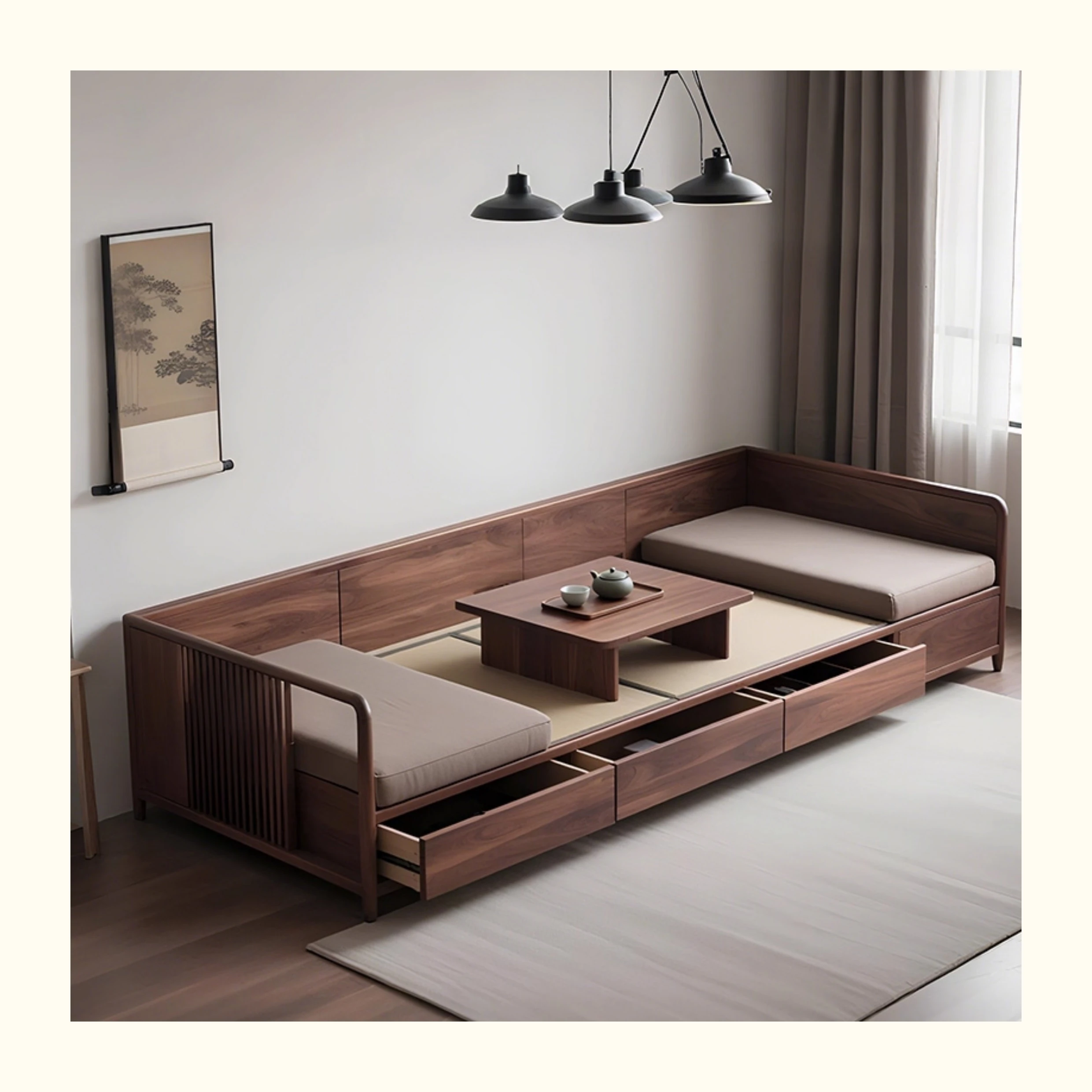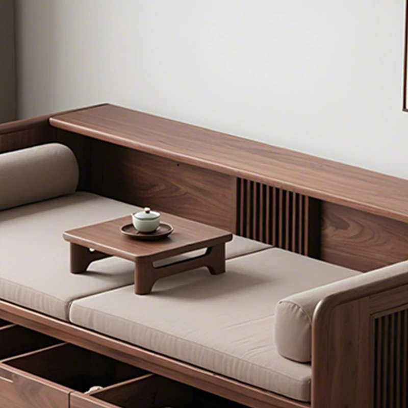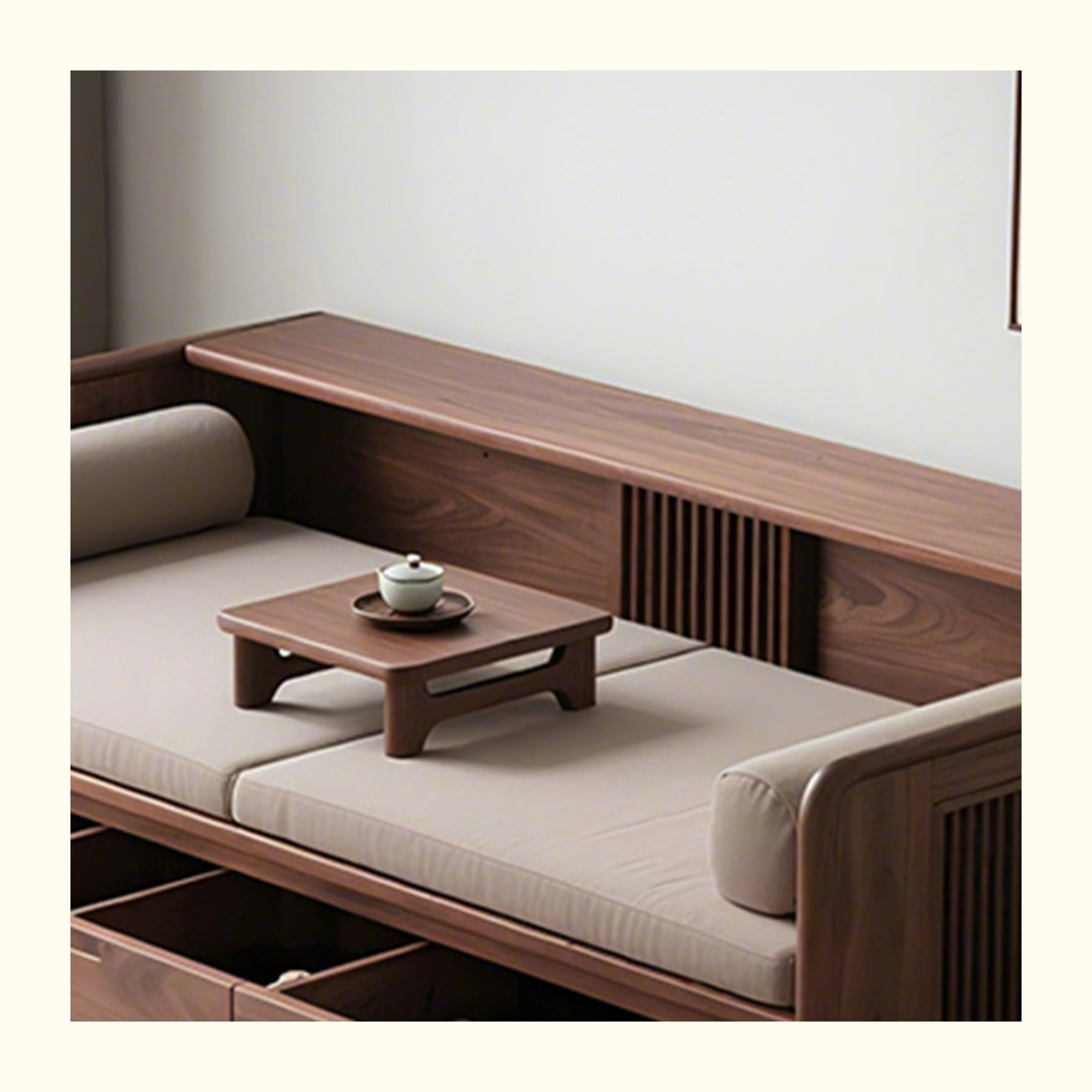 新中式スタイルのブラックウォールナット無垢材ソファ|冬夏兼用・収納付き・リラックスできる禅の雰囲気のローハンベッド|おしゃれで機能的なリビング家具!