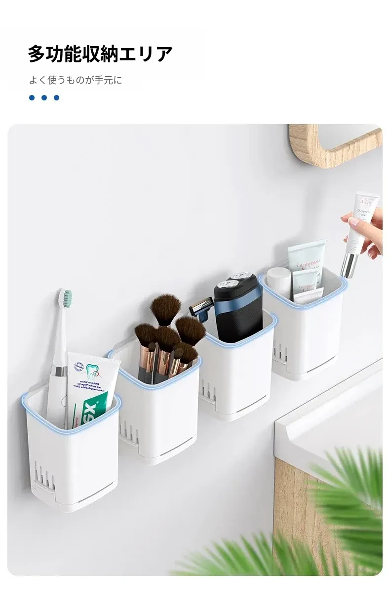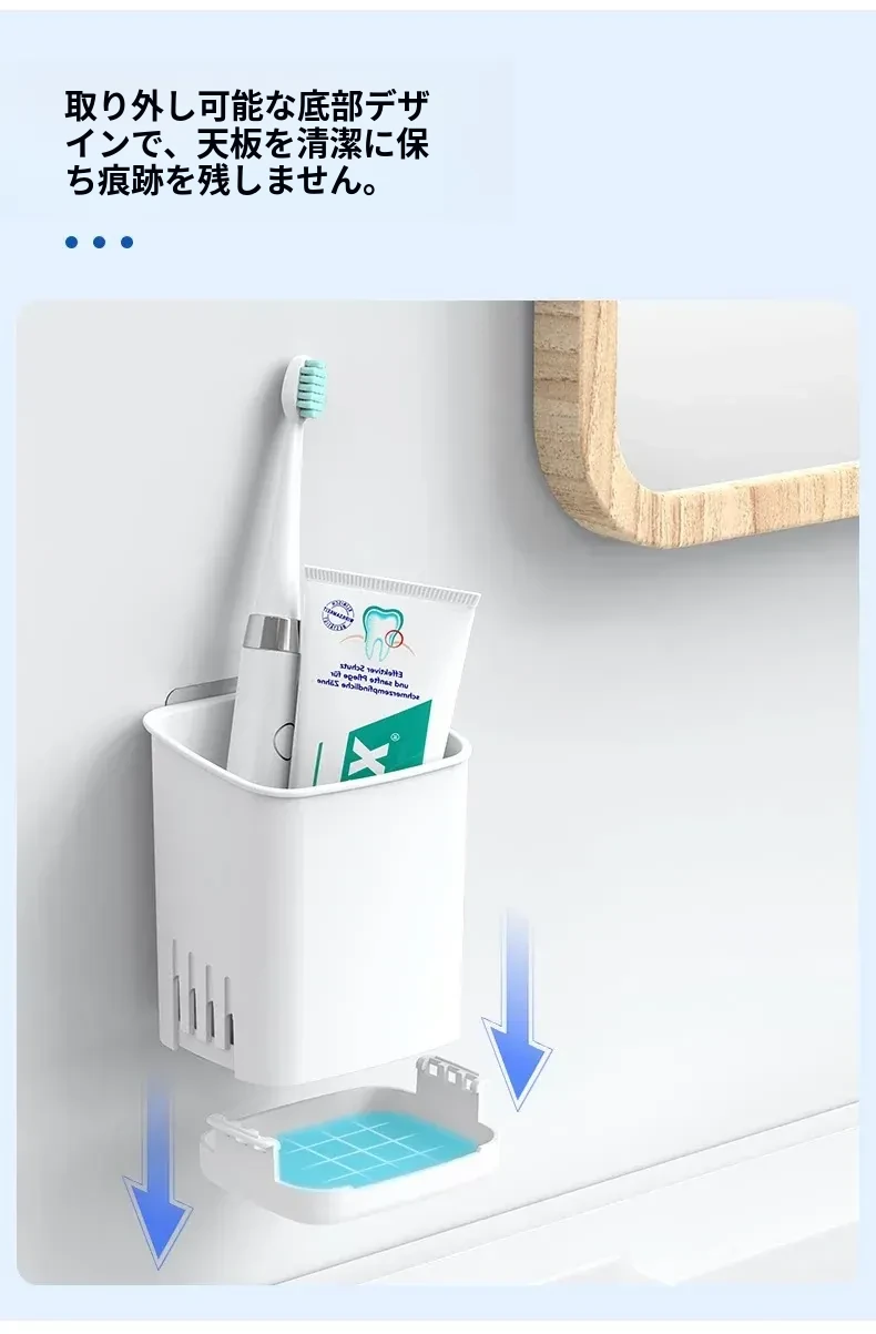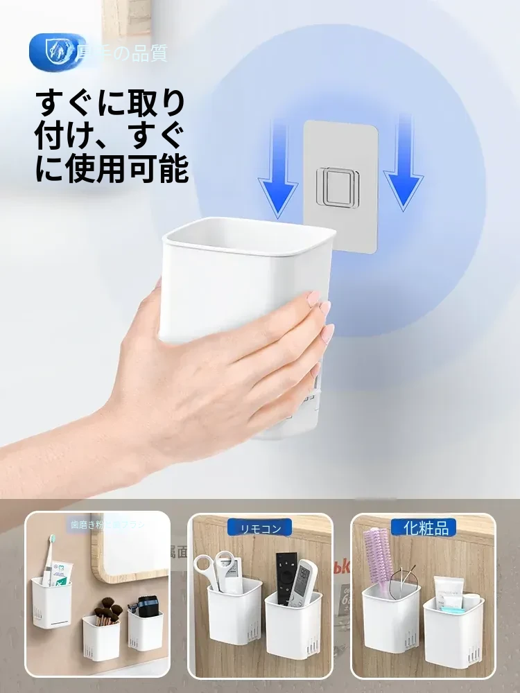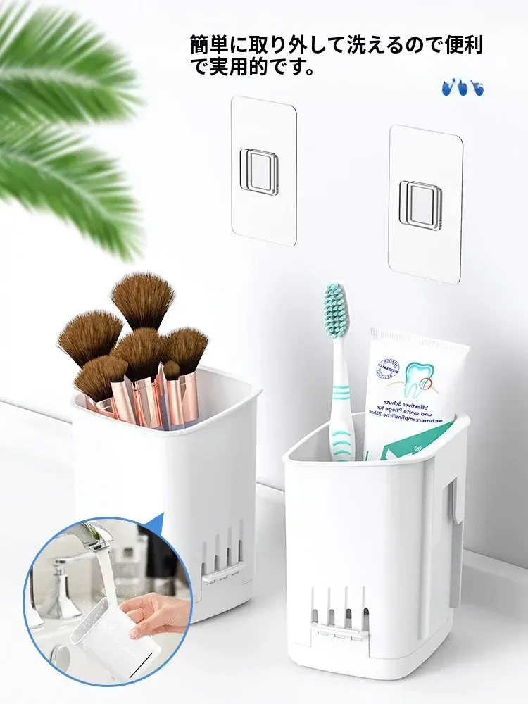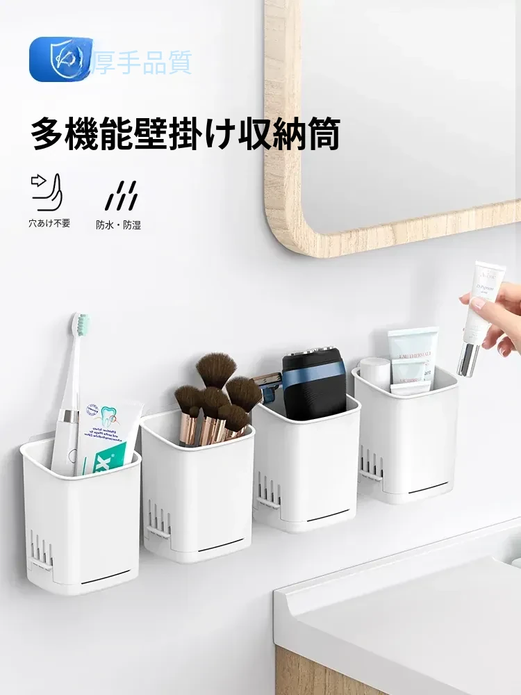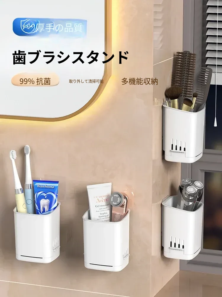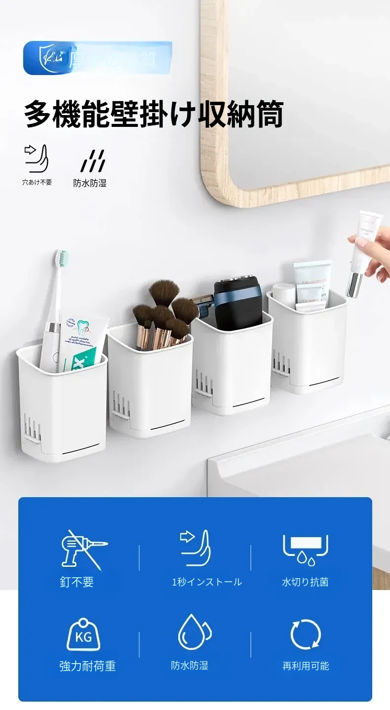 穴あけ不要で簡単取り付け!バスルーム・トイレ用洗面台収納筒 - 歯ブラシ・歯磨き粉・櫛をスッキリ整理!スペースを有効活用できる便利な置物ラックです。