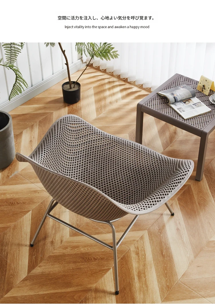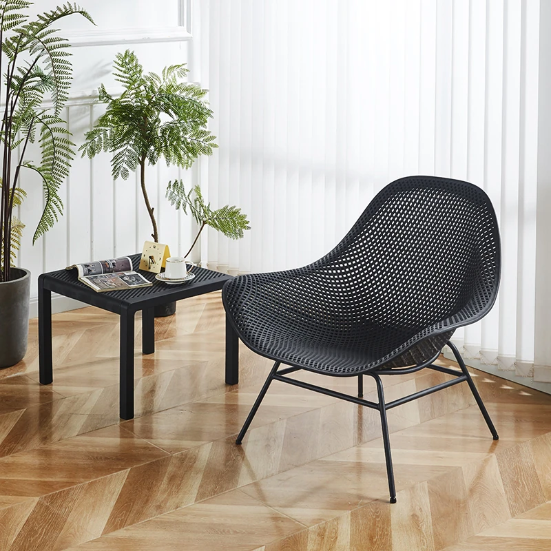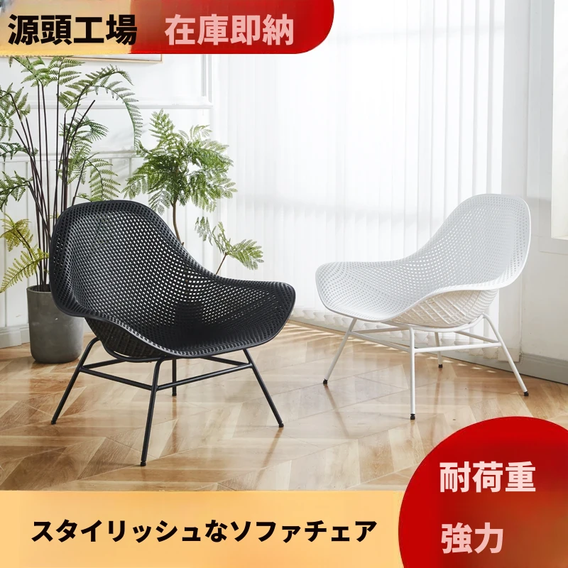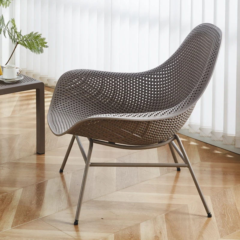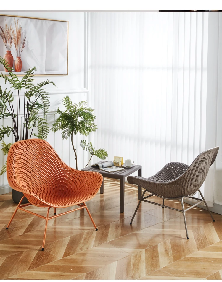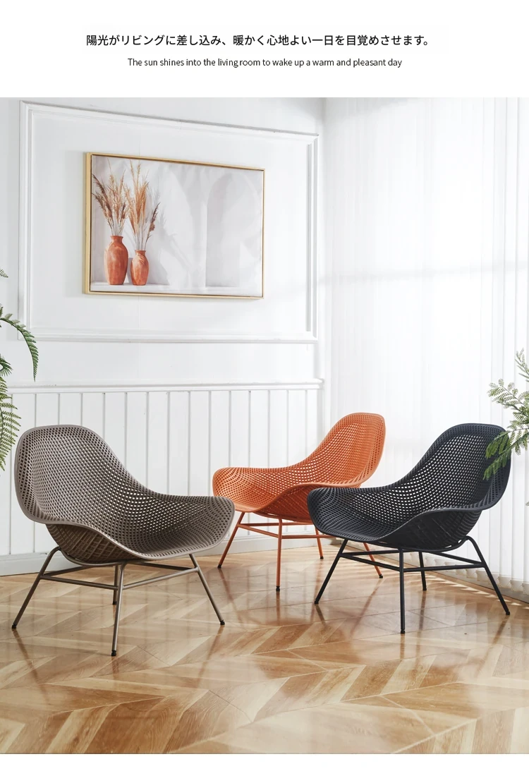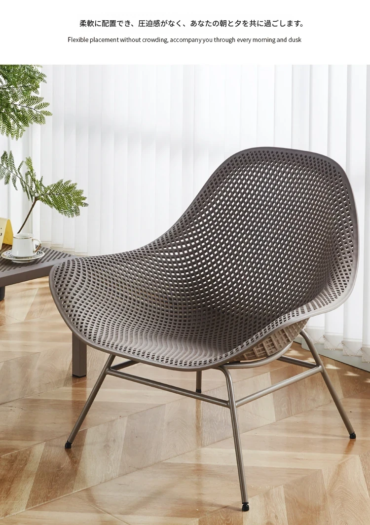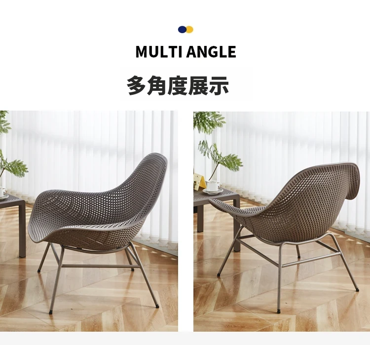 北欧風シンプルモダンなカフェ用リクライニングチェア - おしゃれな透かしデザイン、快適な座り心地で、リラックスできるひとときを提供します。シングルソファとしても最適、会話を楽しむのにぴったりな一脚です。