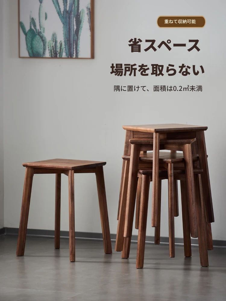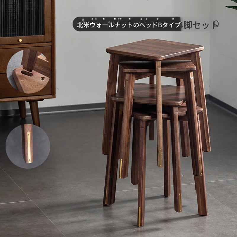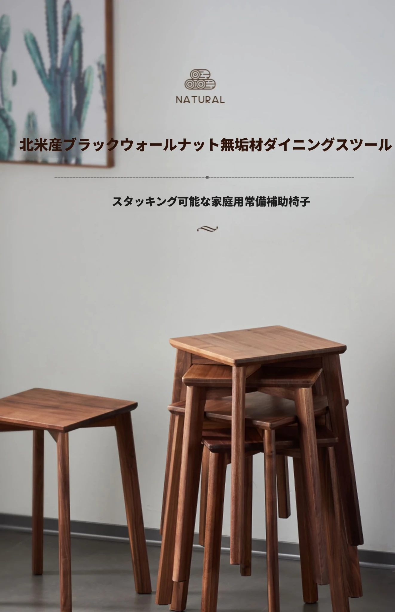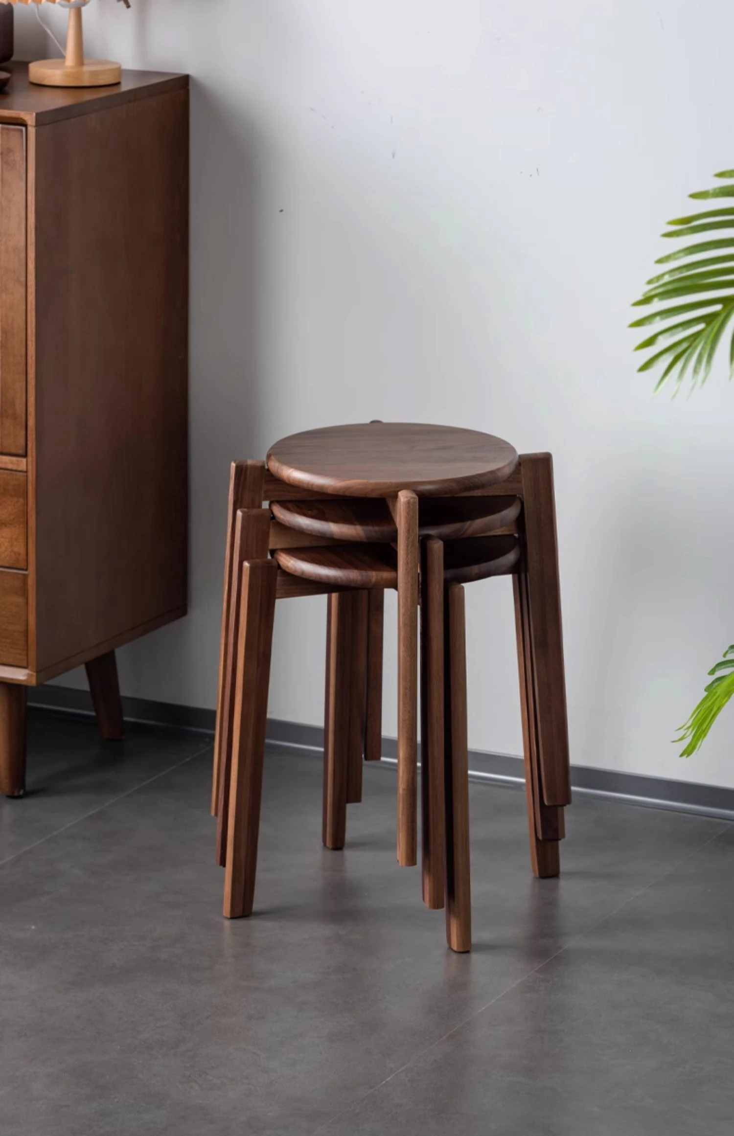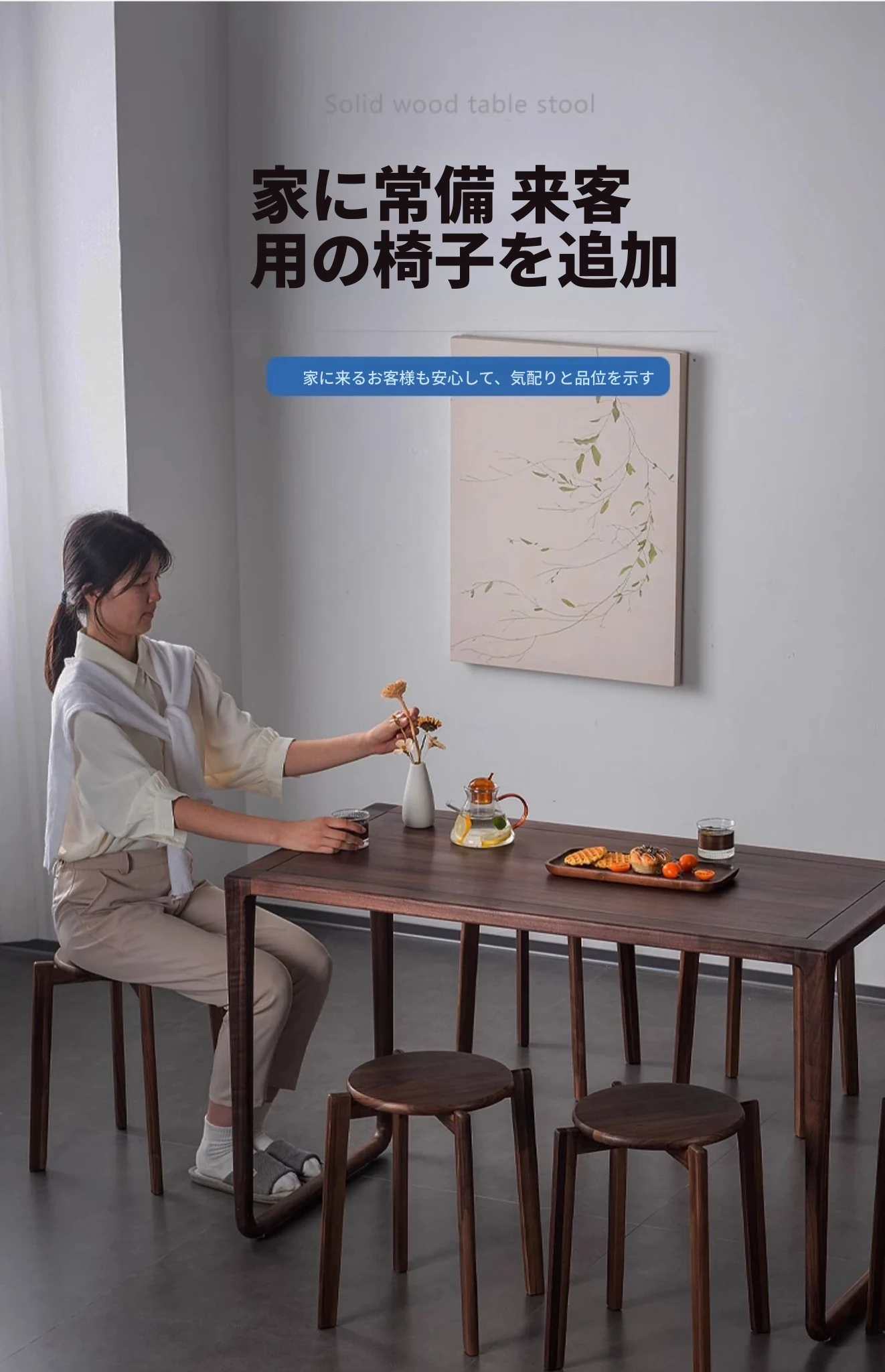 北米産ブラックウォールナットの無垢材スツール - 家庭用に最適なスタッキング可能な円形スツール、ダイニングチェアやローチェアとしても使える!おしゃれで機能的なデザインで、あなたの食卓を素敵に演出します。