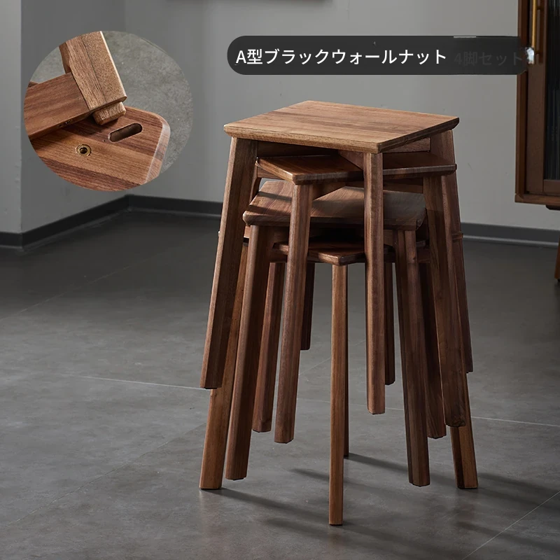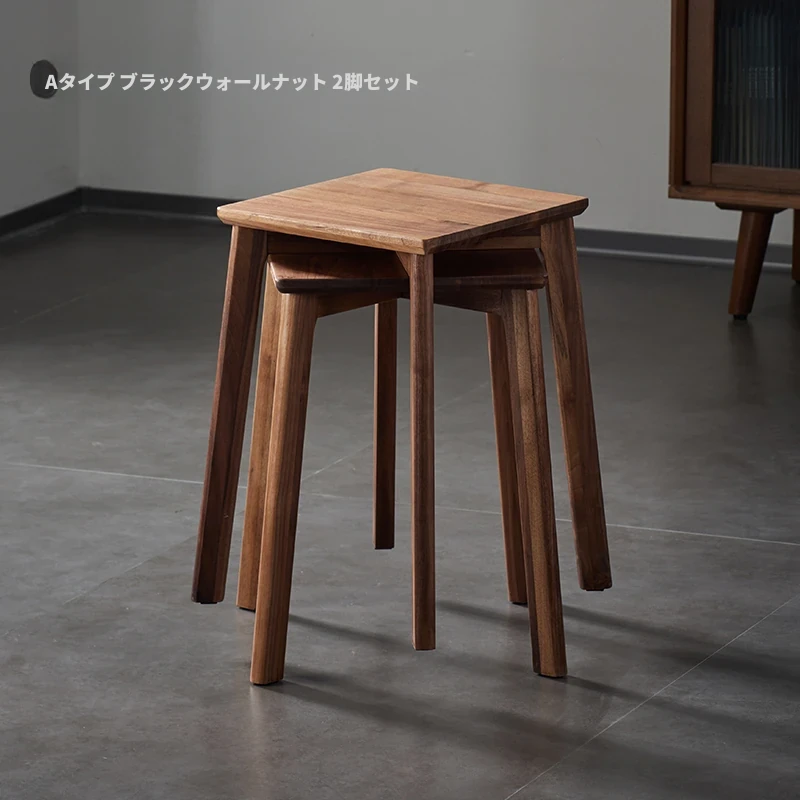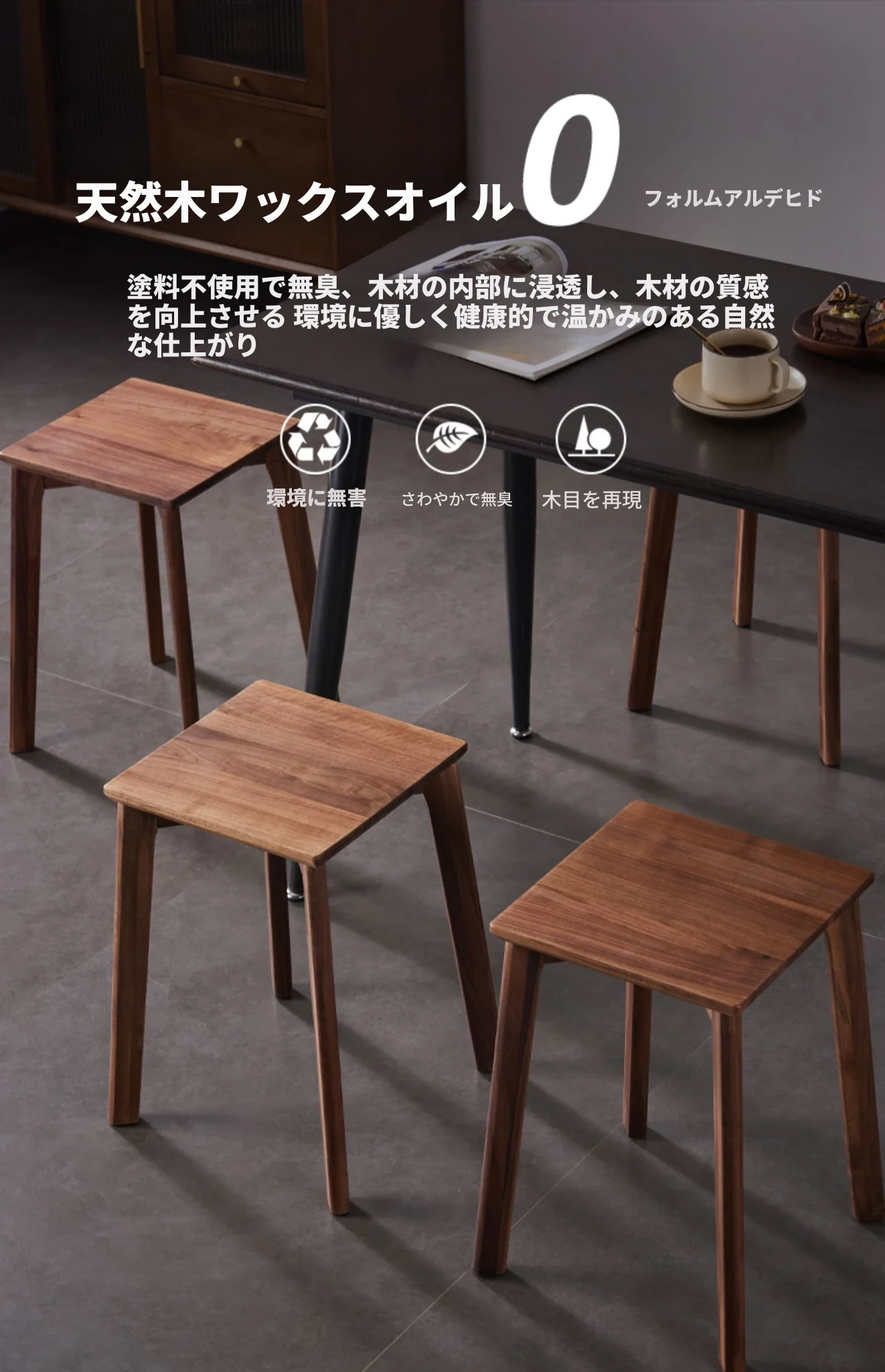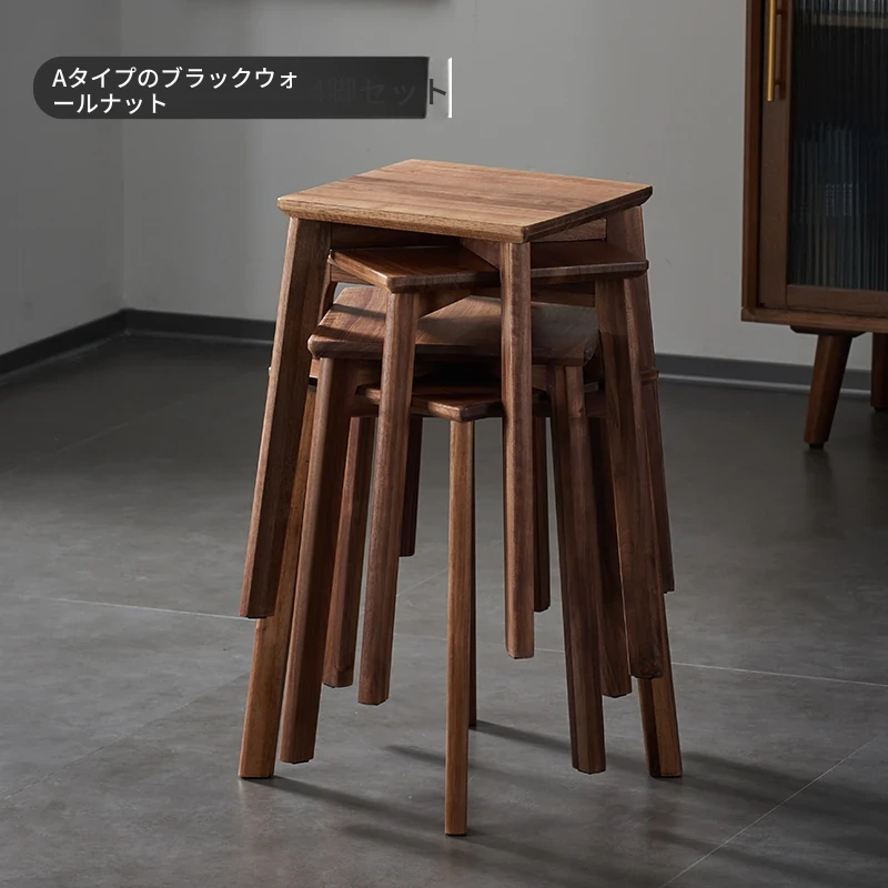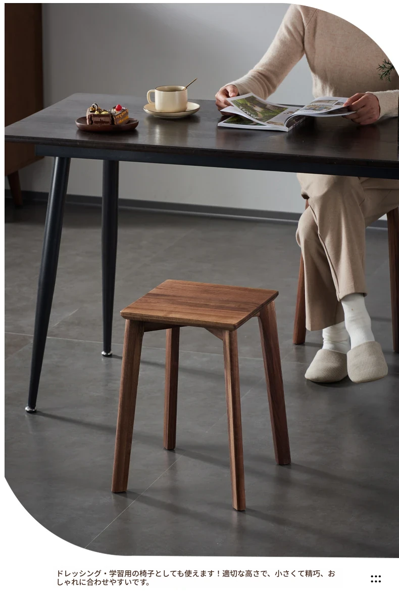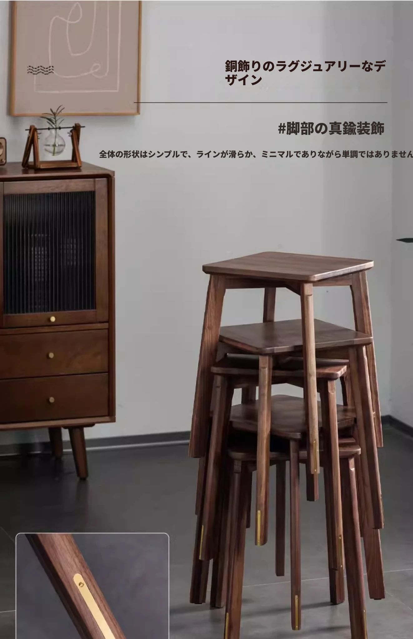 北米産ブラックウォールナットの無垢材スツール - 家庭用に最適なスタッキング可能な円形スツール、ダイニングチェアやローチェアとしても使える!おしゃれで機能的なデザインで、あなたの食卓を素敵に演出します。