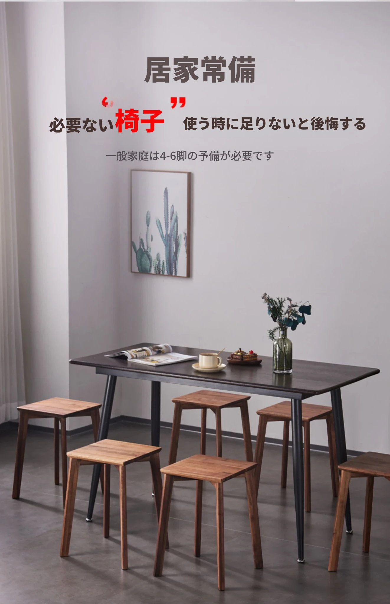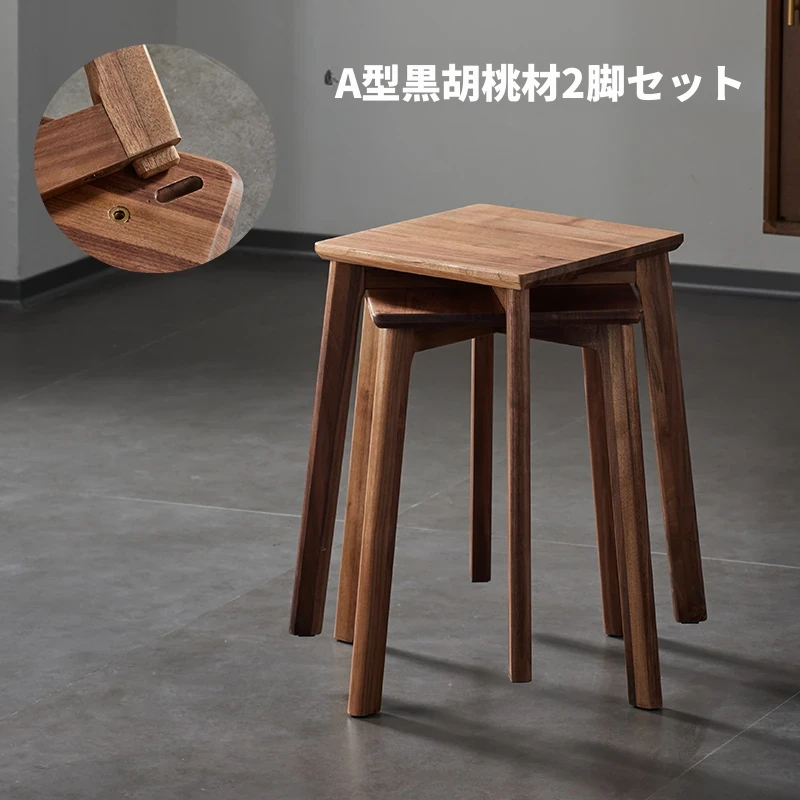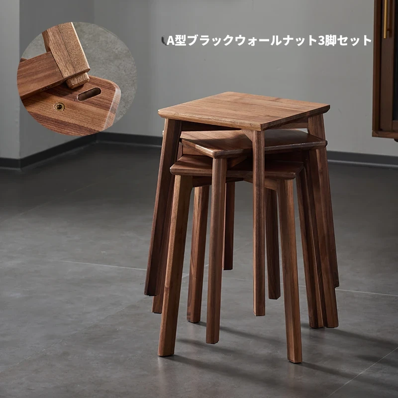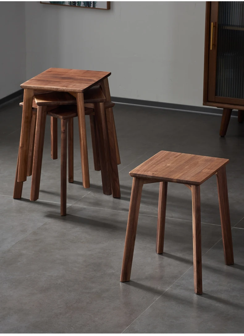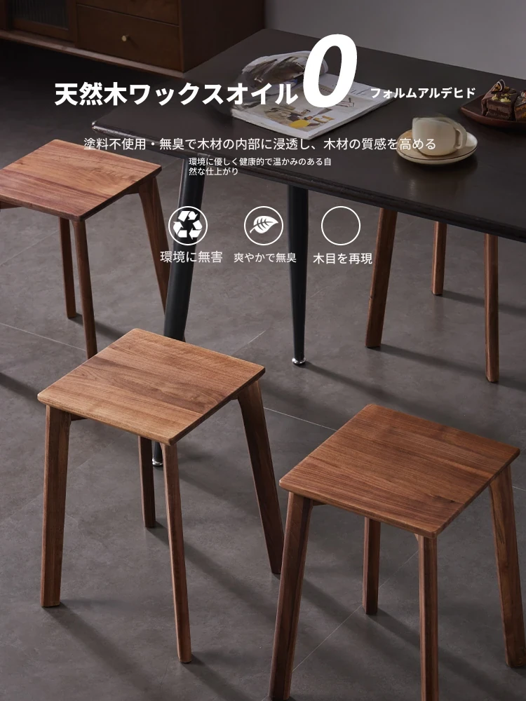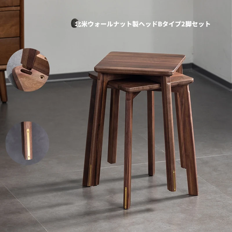 北米産ブラックウォールナットの無垢材スツール - 家庭用に最適なスタッキング可能な円形スツール、ダイニングチェアやローチェアとしても使える!おしゃれで機能的なデザインで、あなたの食卓を素敵に演出します。