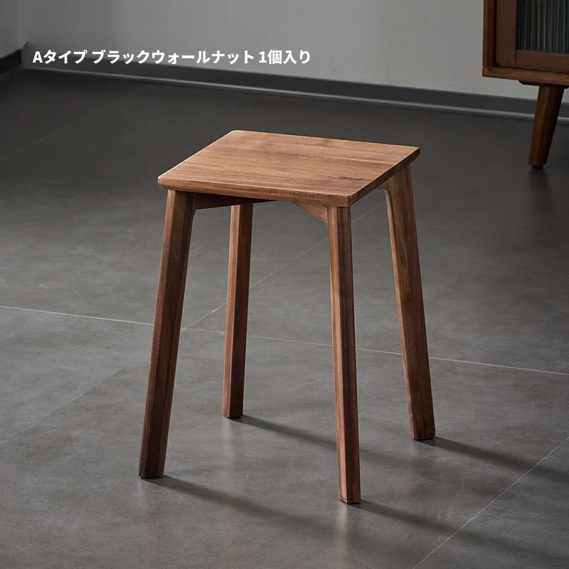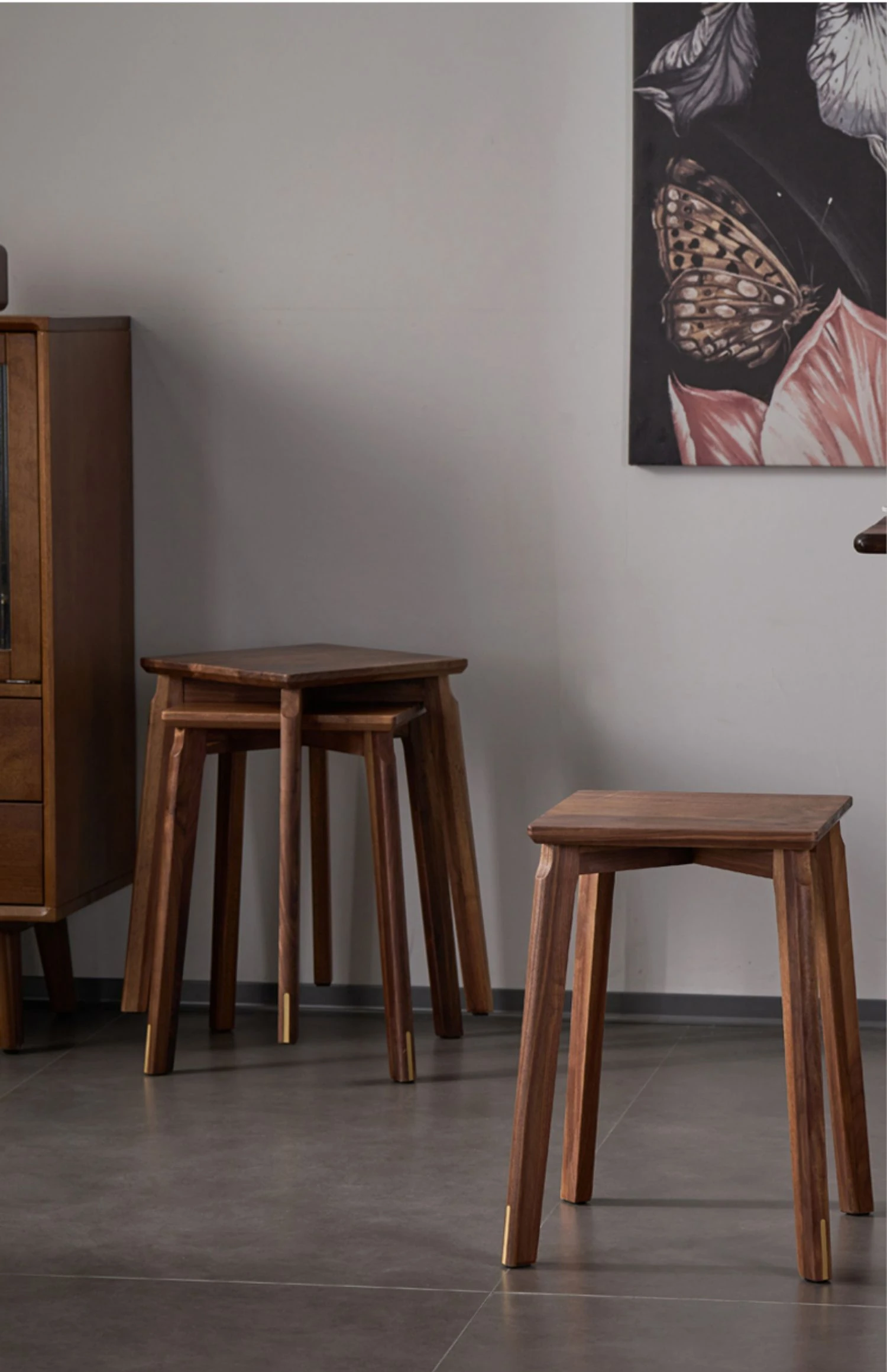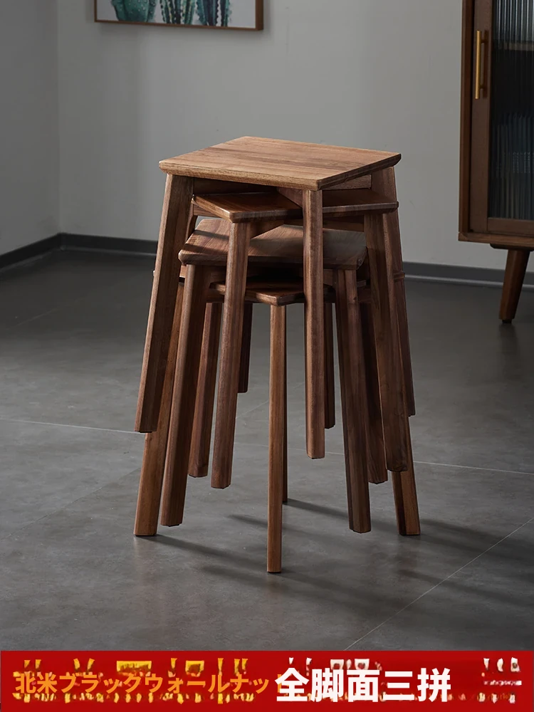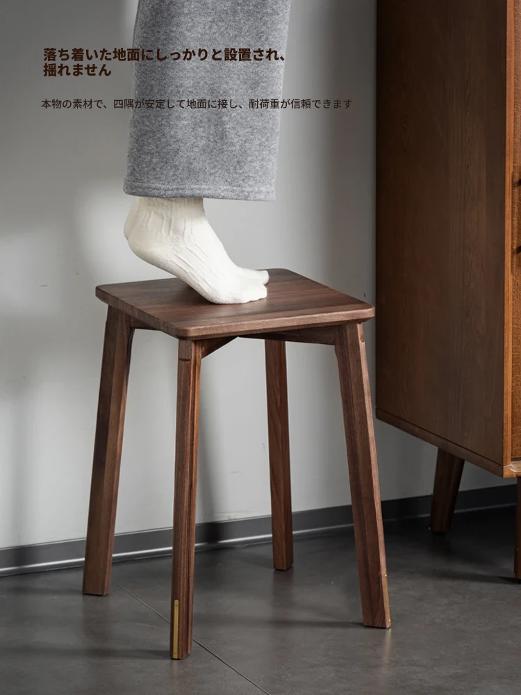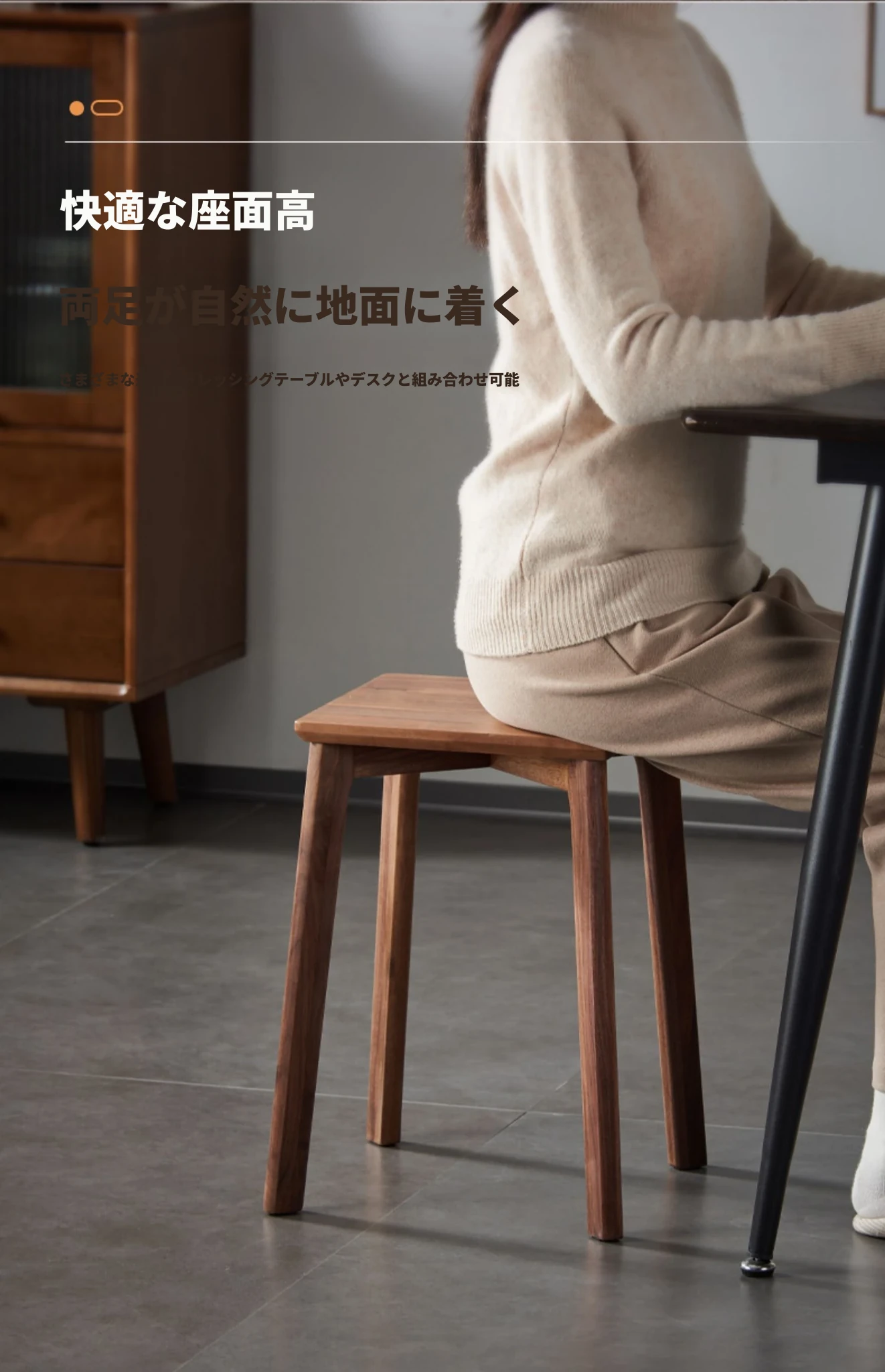 北米産ブラックウォールナットの無垢材スツール - 家庭用に最適なスタッキング可能な円形スツール、ダイニングチェアやローチェアとしても使える!おしゃれで機能的なデザインで、あなたの食卓を素敵に演出します。