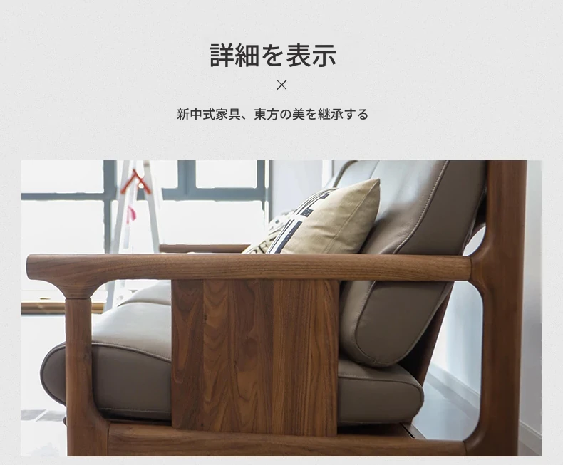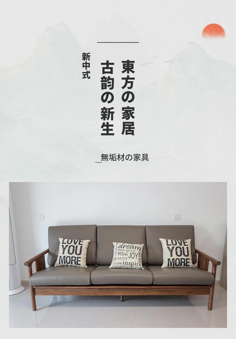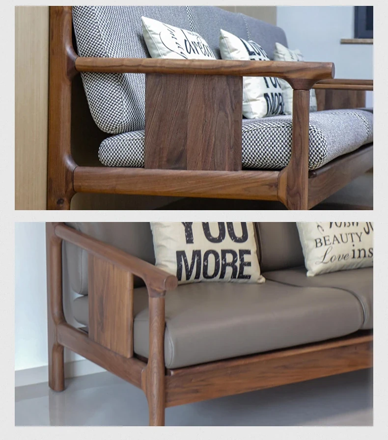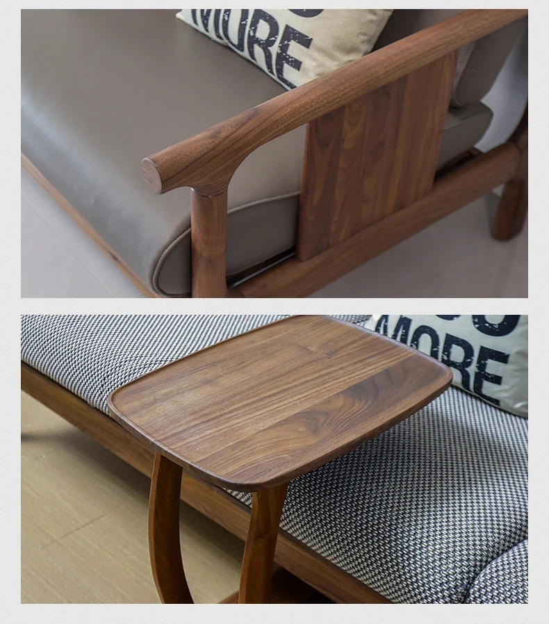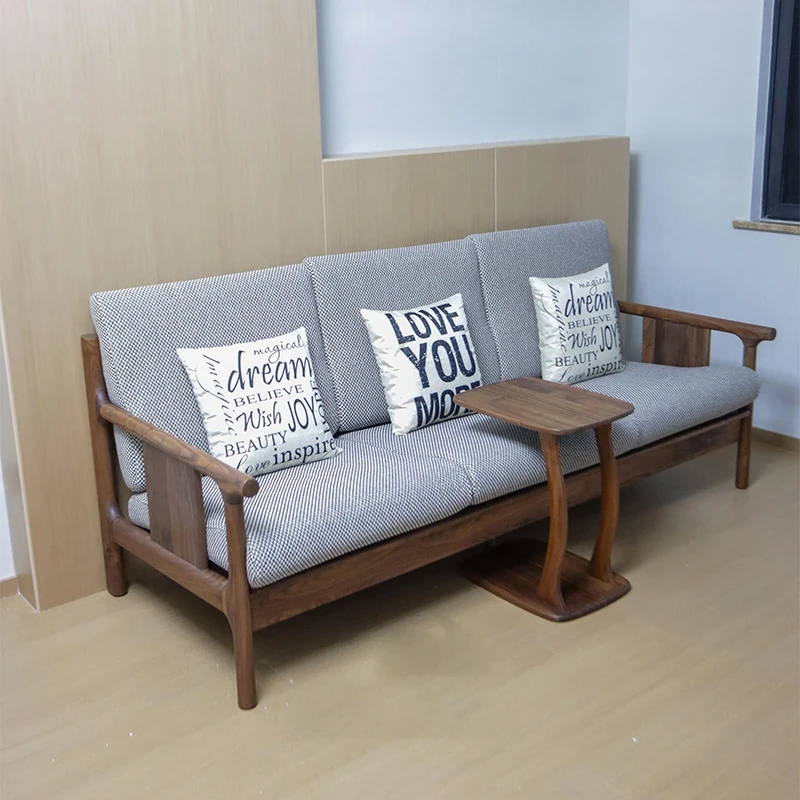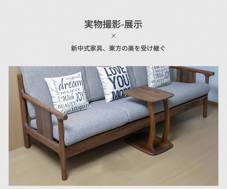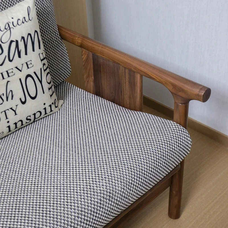 北米産ブラックウォールナット無垢材使用のファブリックソファ - 新中式スタイルの3人掛け、北欧ミニマルデザインで洗練されたリビング家具!