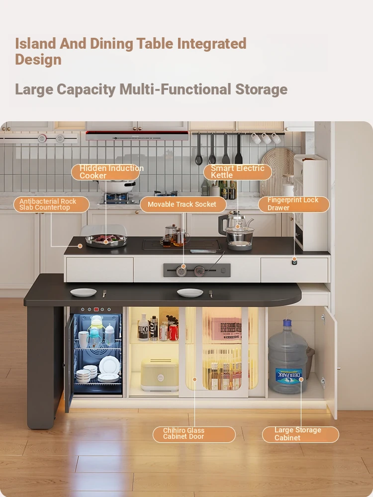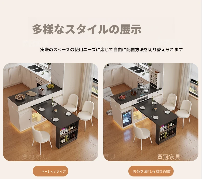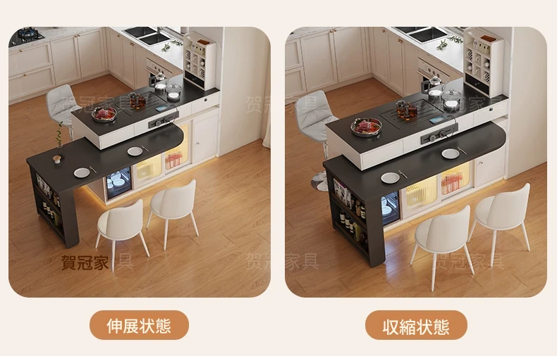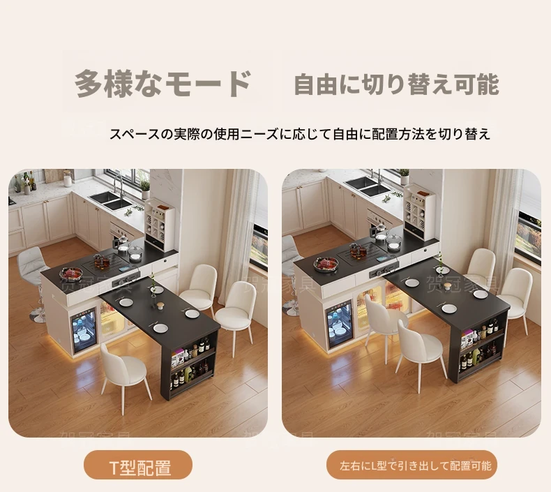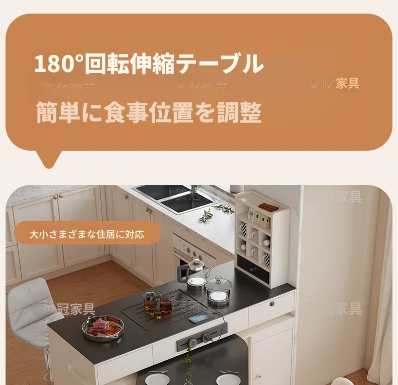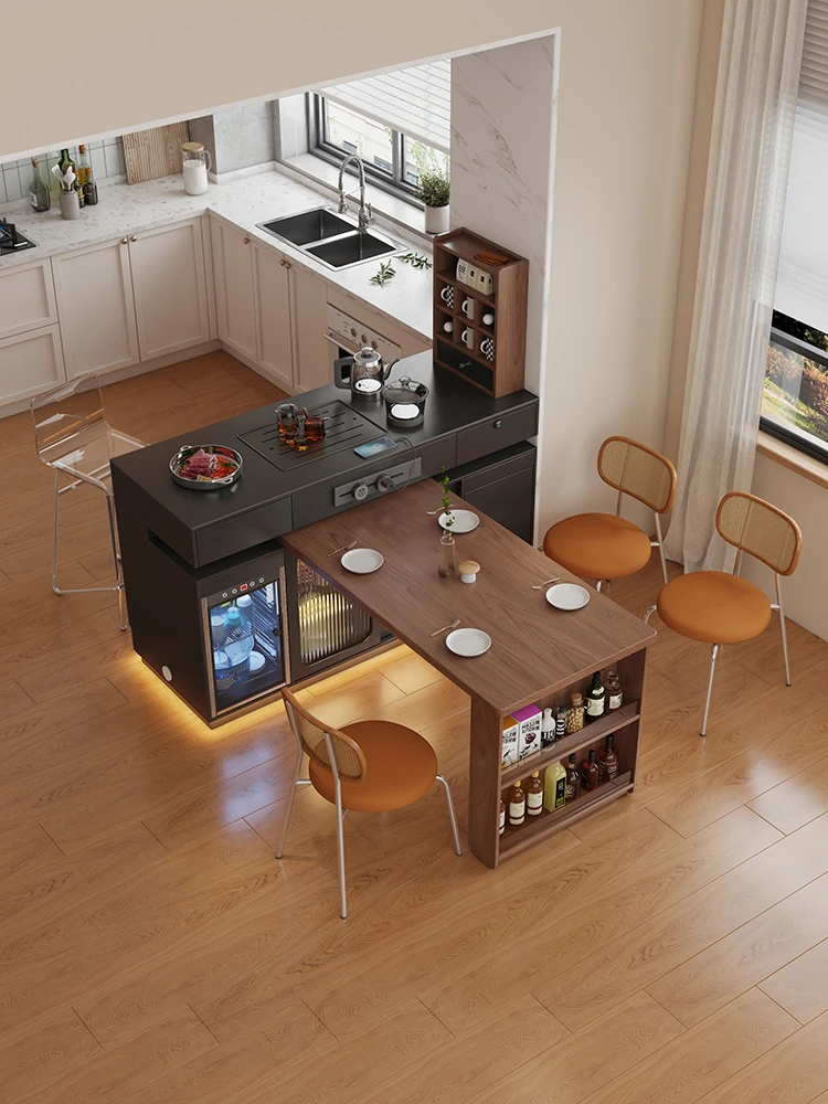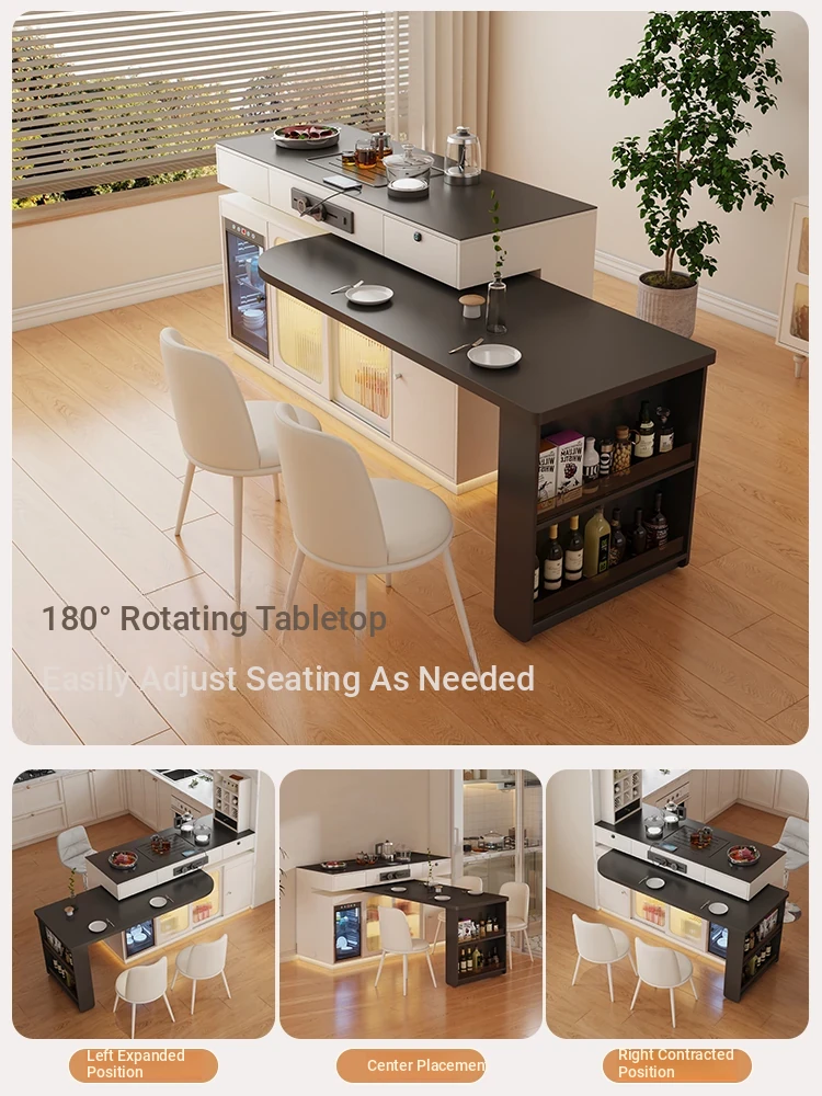 イタリアンスタイルの折りたたみダイニングテーブル - 高級ブラック、伸縮自在のアイランドテーブル、便利なコンセント付き、最新2025年モデル!電磁調理器も完備。家族や友人との食事に最適!