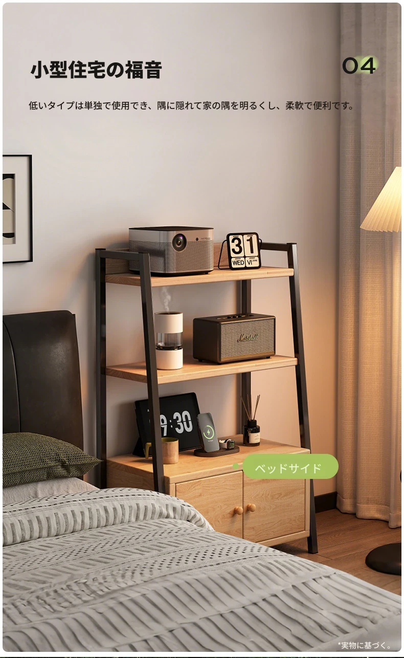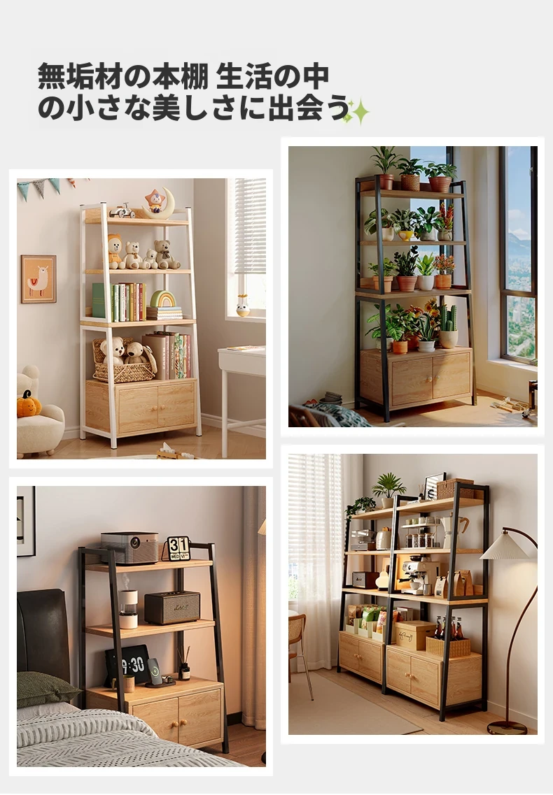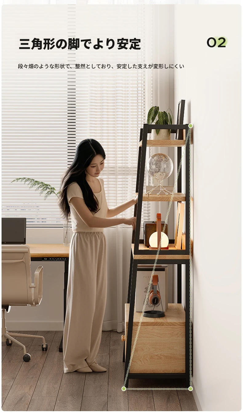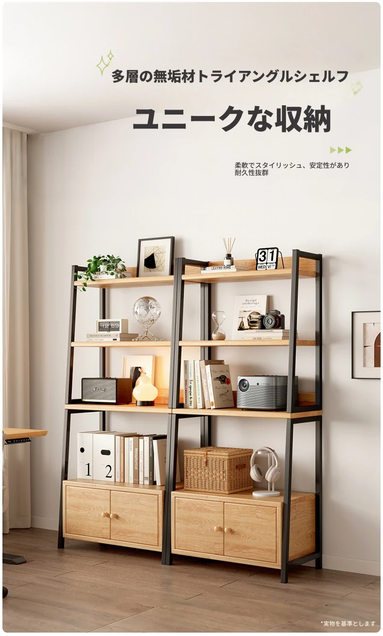 天然木材使用のトライアングルシェルフ!多機能なフロア収納棚で、壁に寄りかかるデザイン。多層キャビネットとして便利に使え、シンプルな書棚やディスプレイとしても最適です。あなたの生活空間をスタイリッシュに演出!