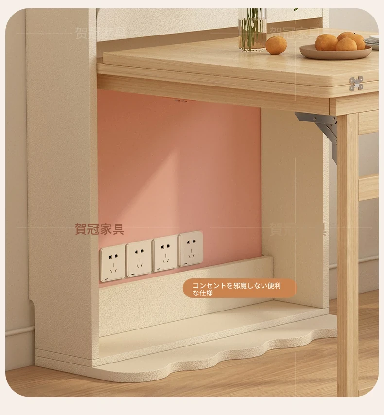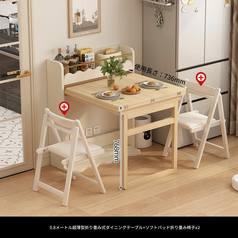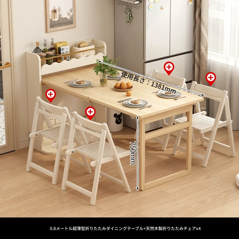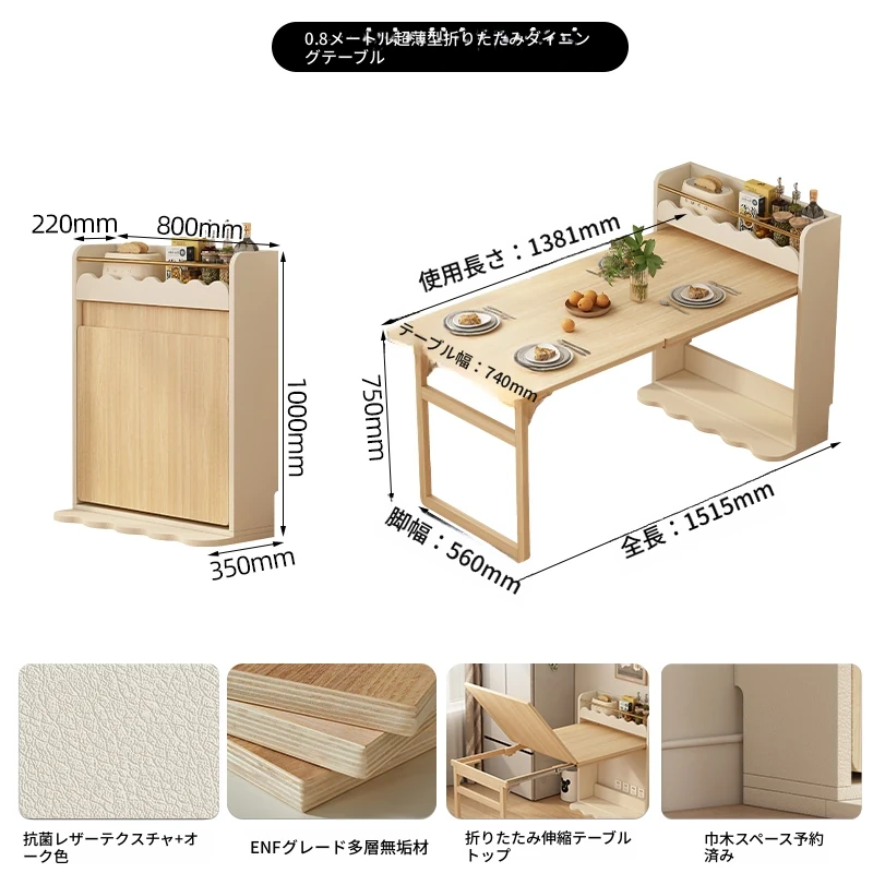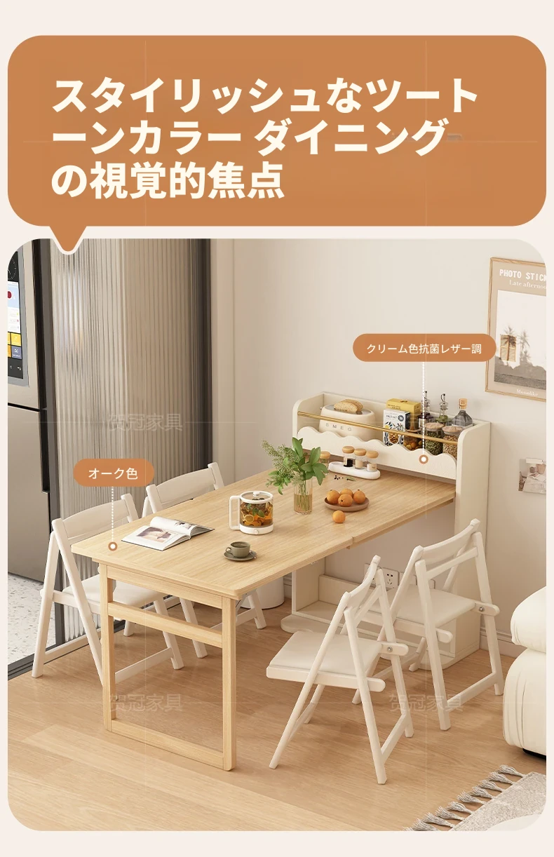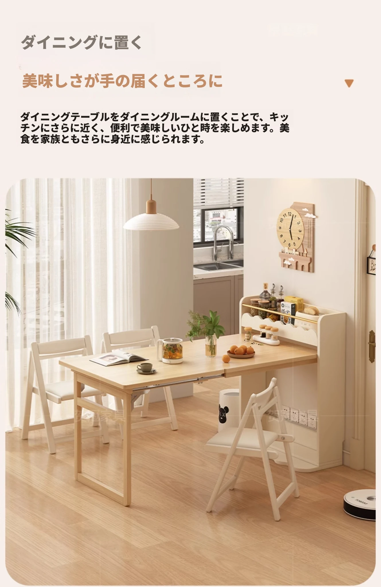 ナチュラルウッドクリームスタイルの伸縮式ダイニングテーブル&スリムサイドキャビネット一体型、コンパクトなお部屋にぴったり!省スペース実現の一押し、壁付け折りたたみ式無垢材テーブル