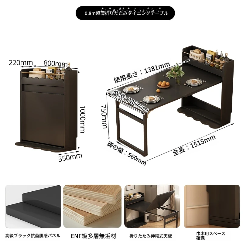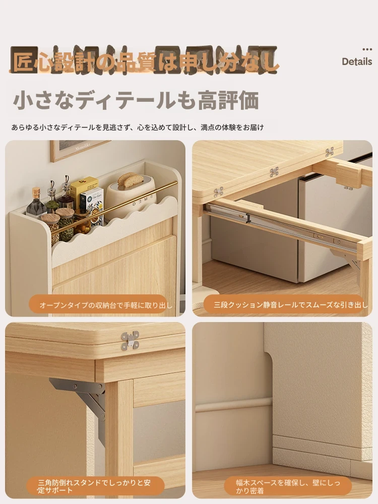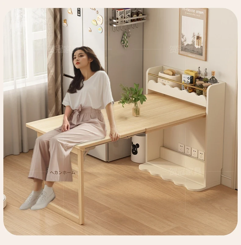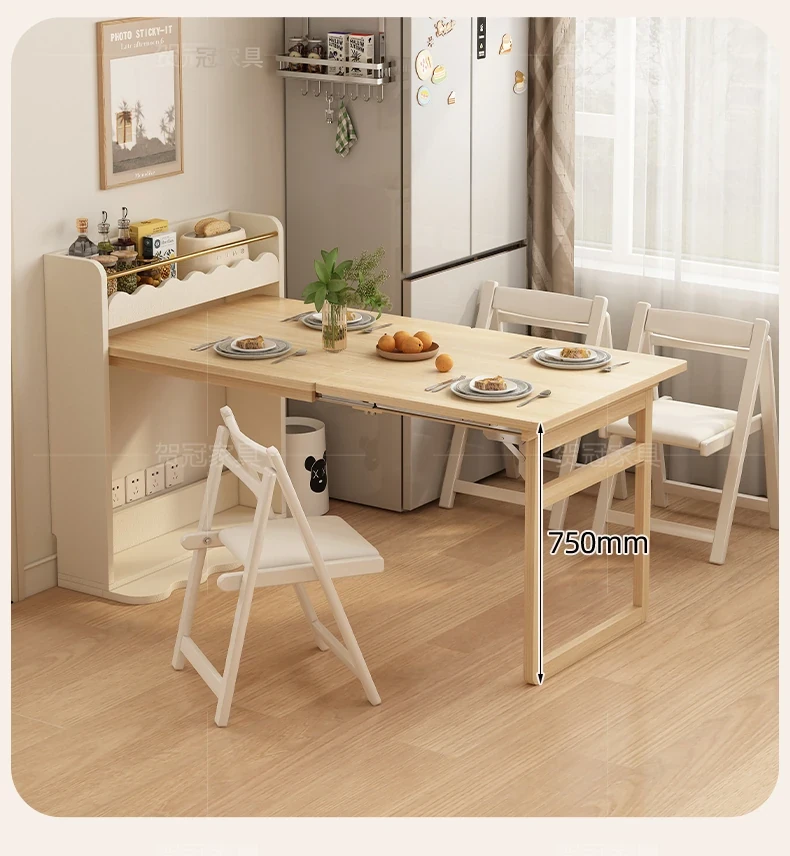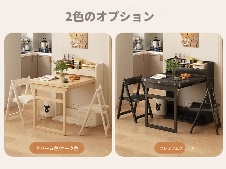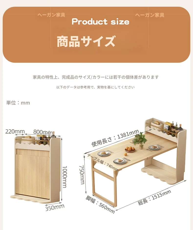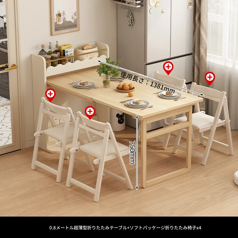 ナチュラルウッドクリームスタイルの伸縮式ダイニングテーブル&スリムサイドキャビネット一体型、コンパクトなお部屋にぴったり!省スペース実現の一押し、壁付け折りたたみ式無垢材テーブル