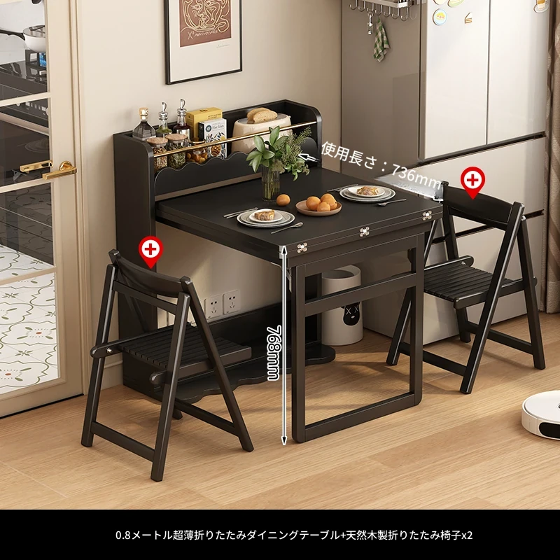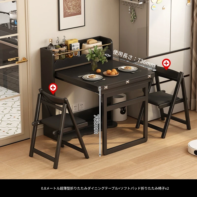 超薄折りたたみテーブル【五重防御抗菌ハイクラスブラック】+木製折りたたみ椅子x2