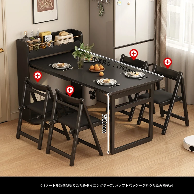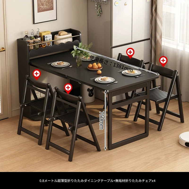 超薄折りたたみテーブル【五重防御抗菌ハイクラスブラック】+木製折りたたみ椅子x4