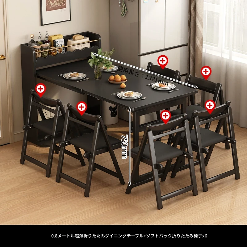 超薄折りたたみテーブル【五重防御抗菌ハイクラスブラック】+木製折りたたみ椅子x6