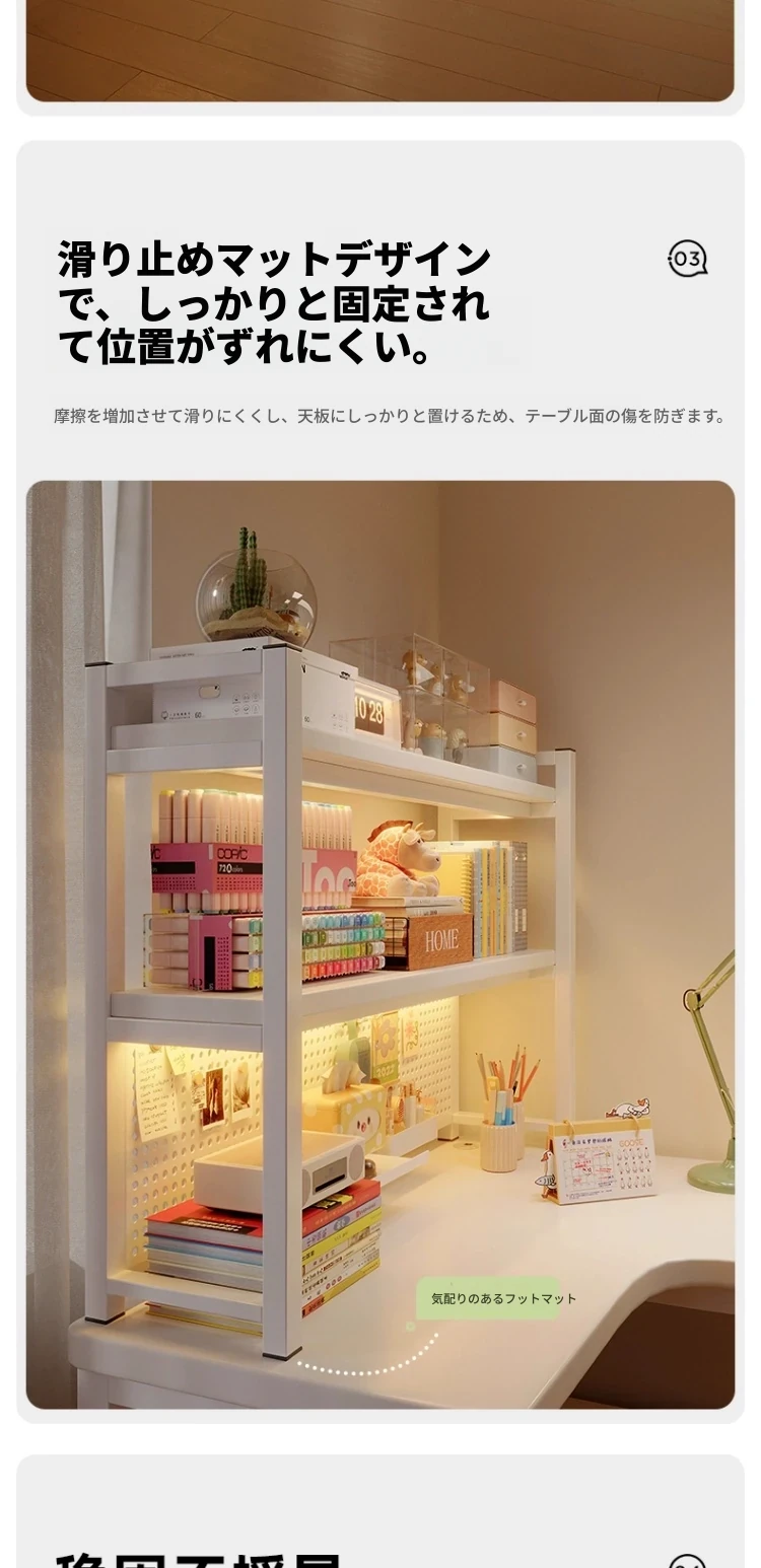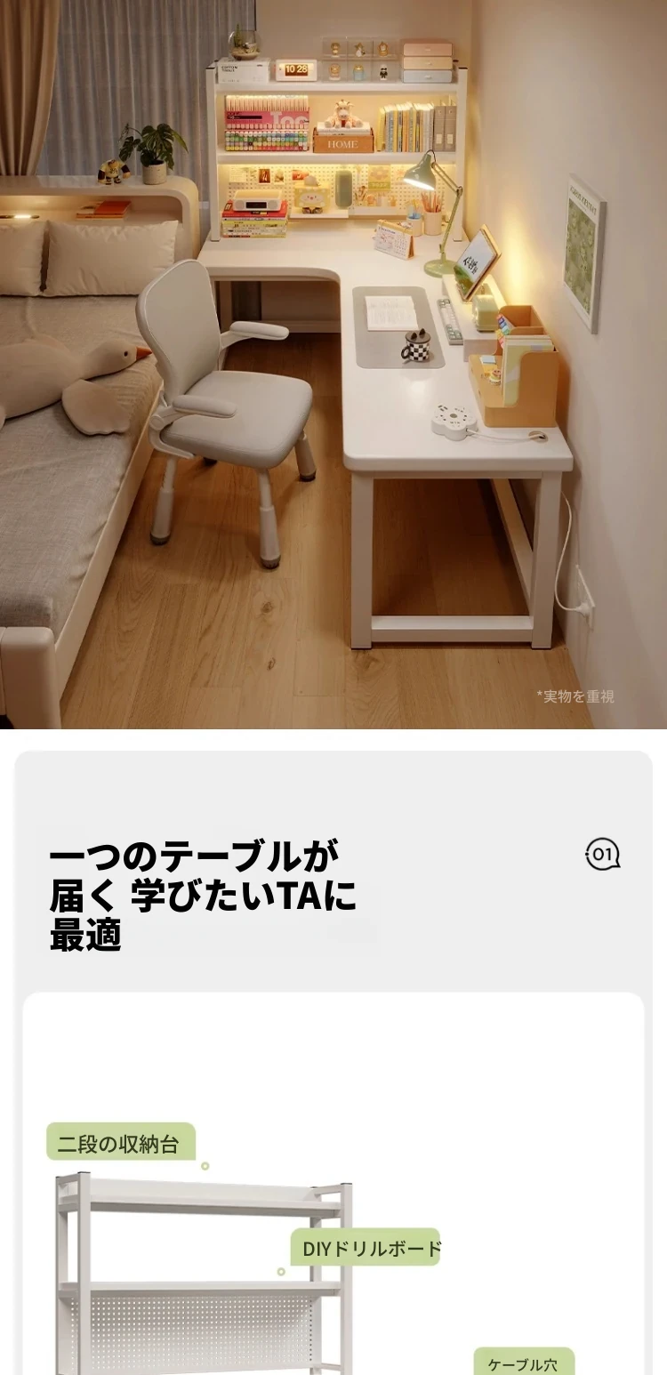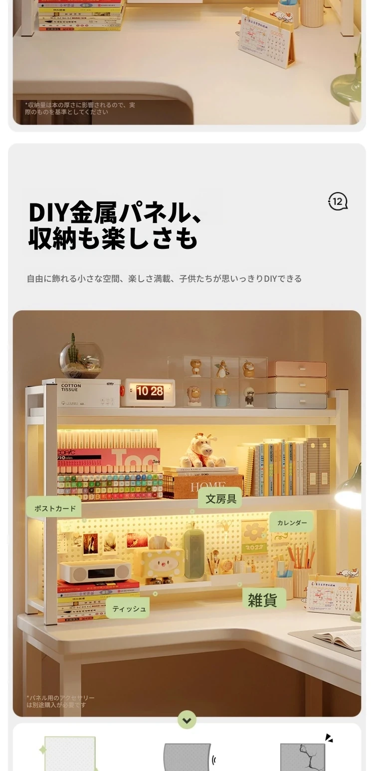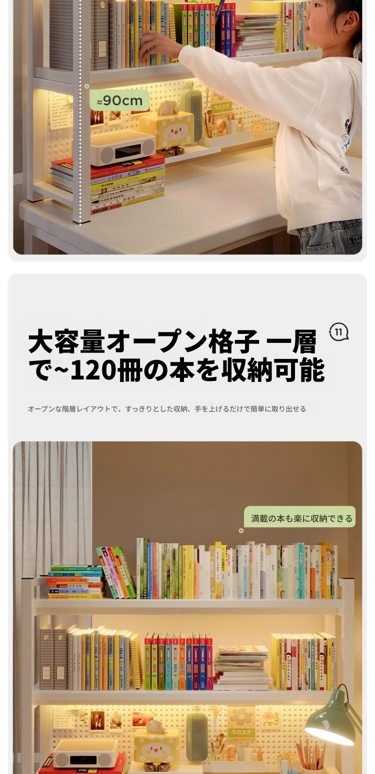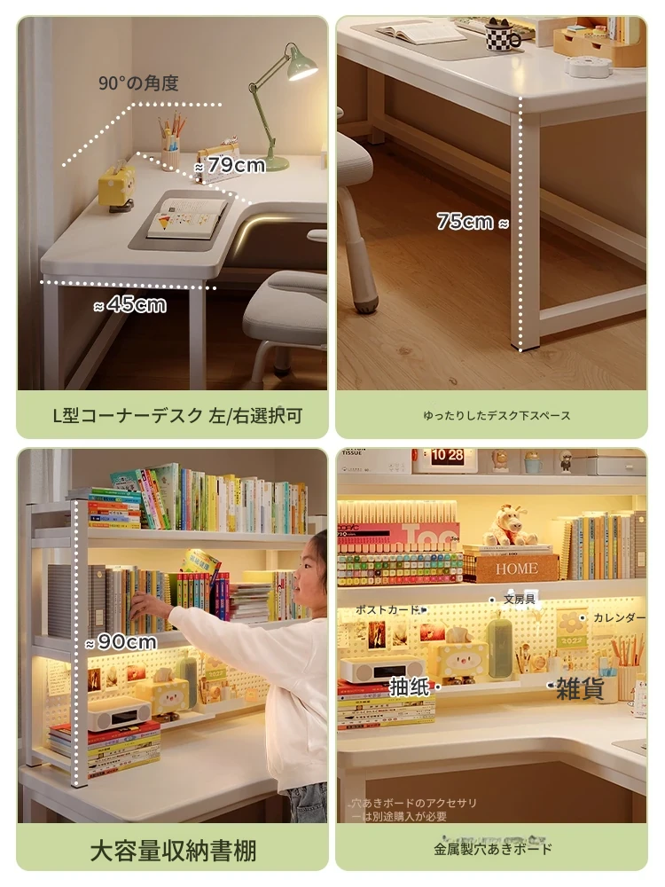 【単卓+書棚+穴あきボード】暖白色右型-主機トレイ/磁石/フック付き