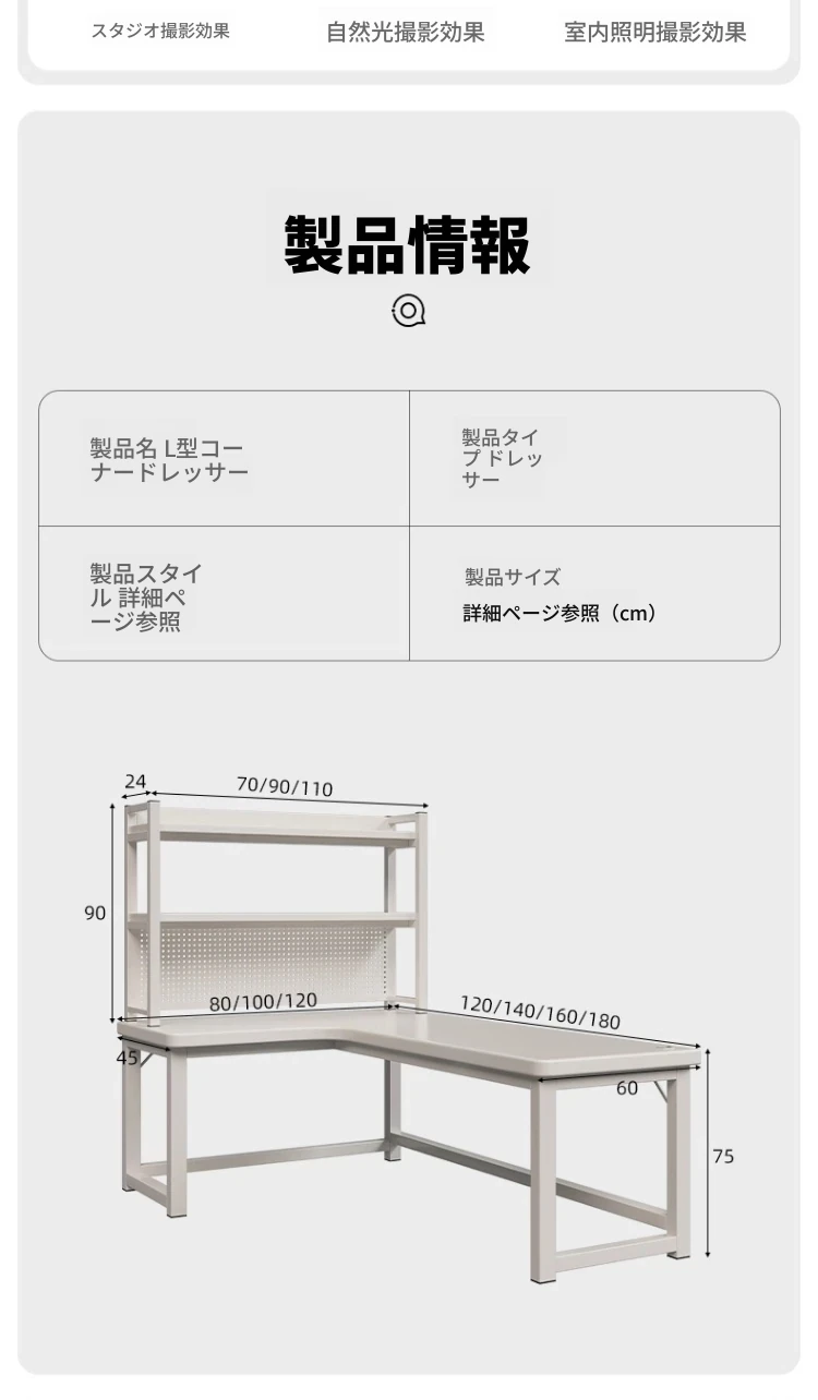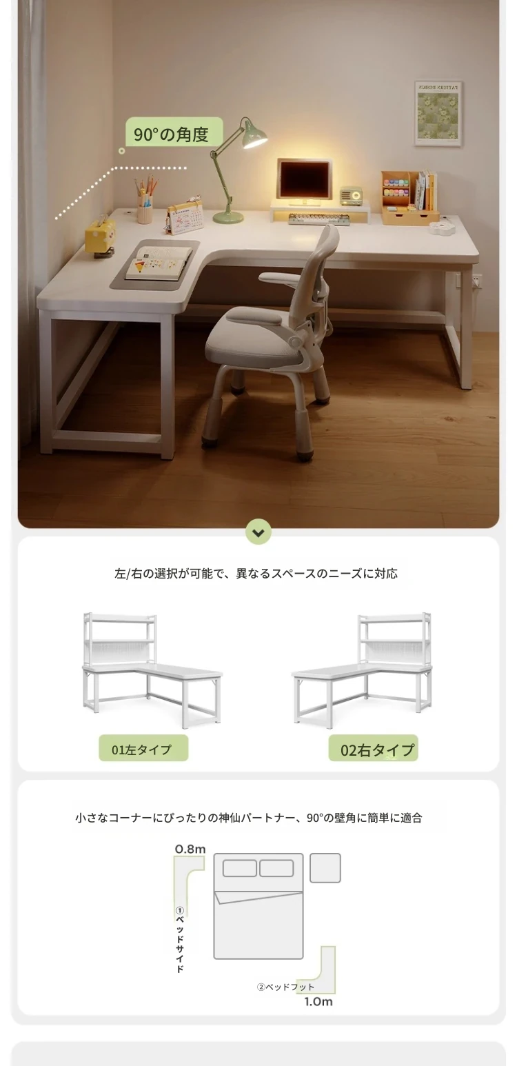角度を生かしたドレッサーデスク一体型!半包囲デザインで美しさと機能性を両立。化粧や作業に最適なサイドボード付き、便利な収納スペースも完備。寝室にぴったりなアイテムです!