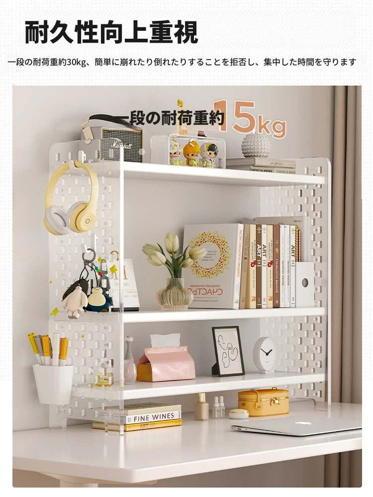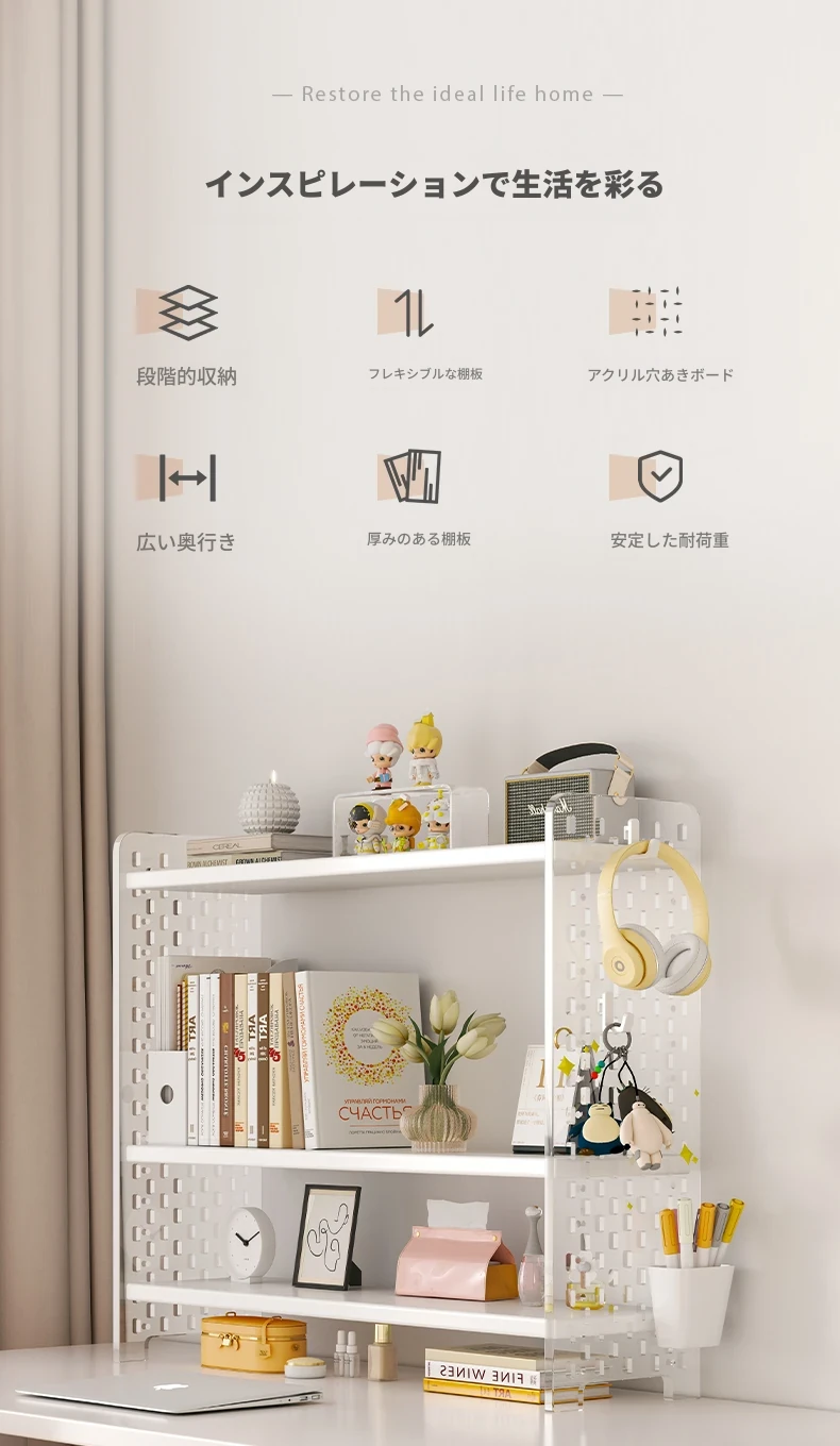 【3段】暖白色+アクリル穴あきボード50*20*60(フック+収納ボックス付き)