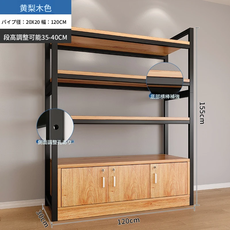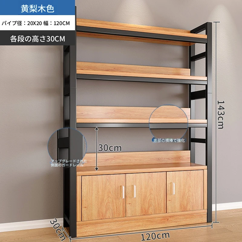 【35-40層高 ダブルボトム横棒】黄梨木+黒フレーム四層ラック120CM