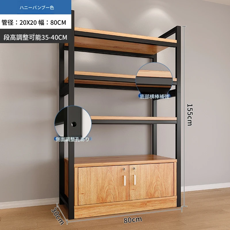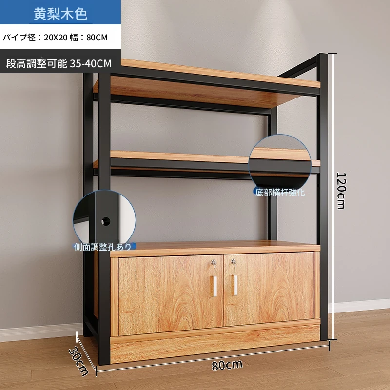 【35-40層高 ダブルボトム横棒】黄梨木+黒フレーム四層ラック80CM