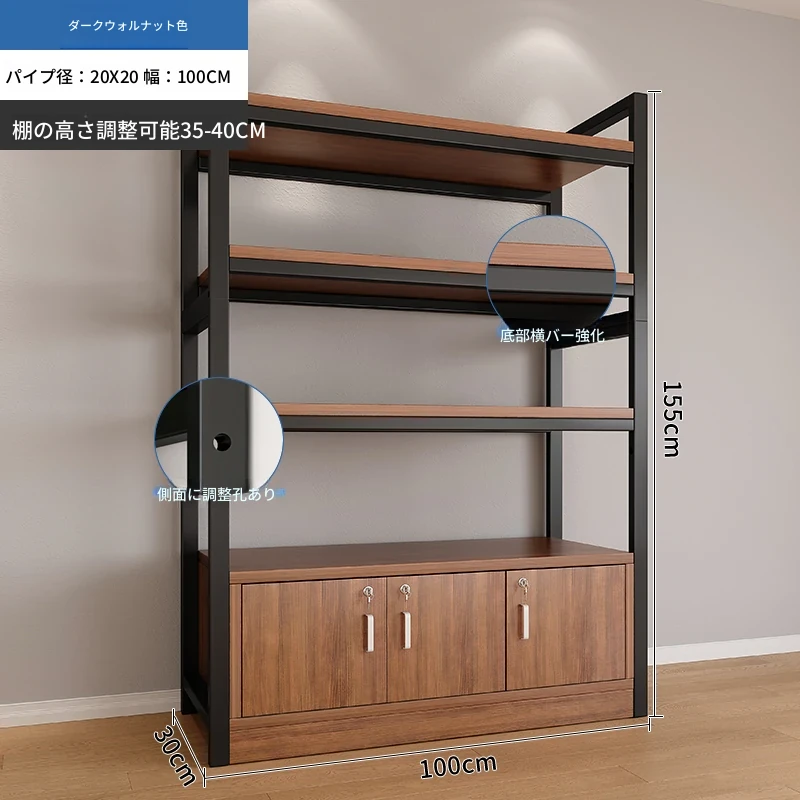 【35-40層高 ダブルボトム横棒】深胡桃+黒フレーム四層ラック100CM