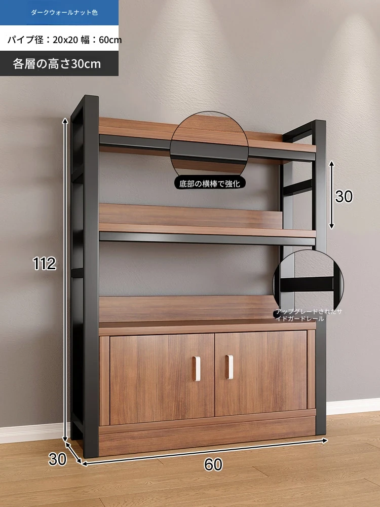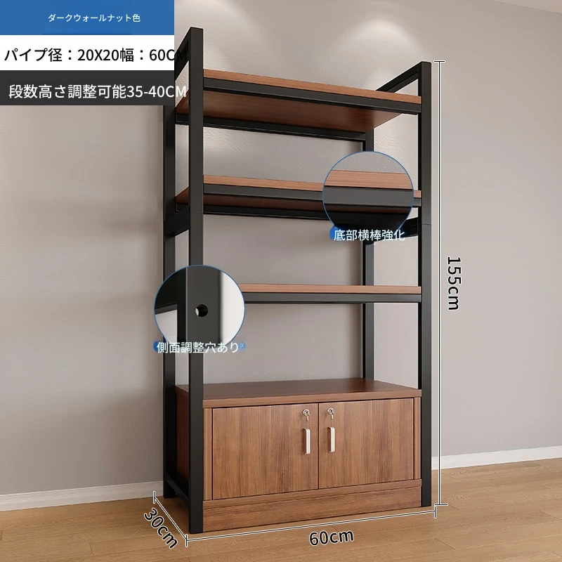 【35-40層高 ダブルボトム横棒】深胡桃+黒フレーム四層ラック60CM