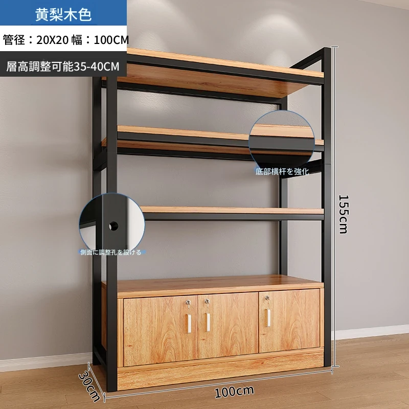 【35-40層高 ダブルボトム横棒】黄梨木+黒フレーム四層ラック100CM
